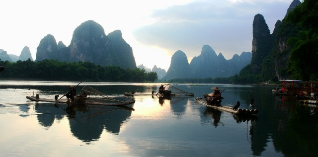 9日下午到兴坪,在漓江边的佛子岩。H哥的叔叔安排了几条竹筏。第一次见到这场面,满有新意的,可是没拍好