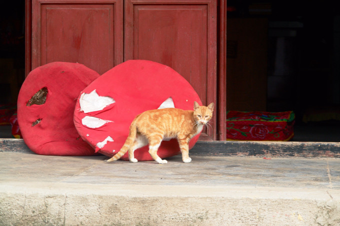大殿门口有只从容不迫的佛系喵。