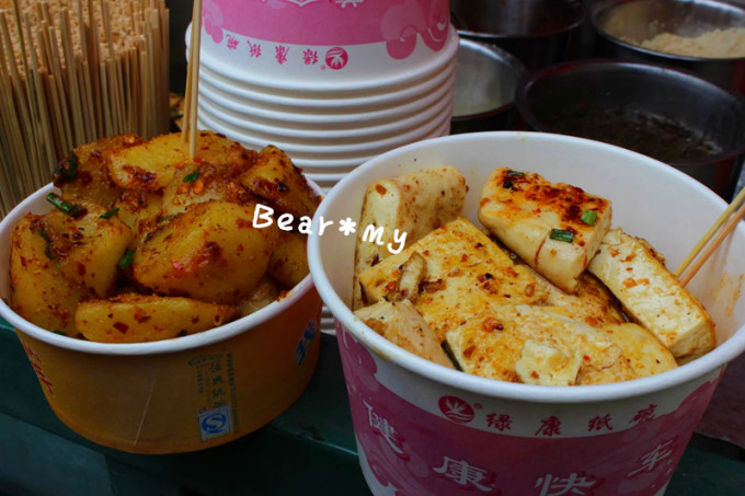 ,其实我还蛮喜欢吃土豆,但是这种土豆块实在是太辣了,吃了一两块就辣得我的肚子一路在翻滚,不怕辣可以试一下,另外一碗是炸豆腐,也挺好吃