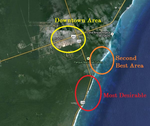 先介绍一下Tulum,这是一个旅游小城市,游客非常多,一条Av. Tulum贯穿整个市中心。平时吃一些当地餐,只要沿着Av. Tulum走就可以了,左右2边都是餐馆,好的餐馆都在Tulum Hotel Zone,沿着海边,和酒店连接,如下图的Second Best Area区域,Most Desirable区域我们没有空去探索了