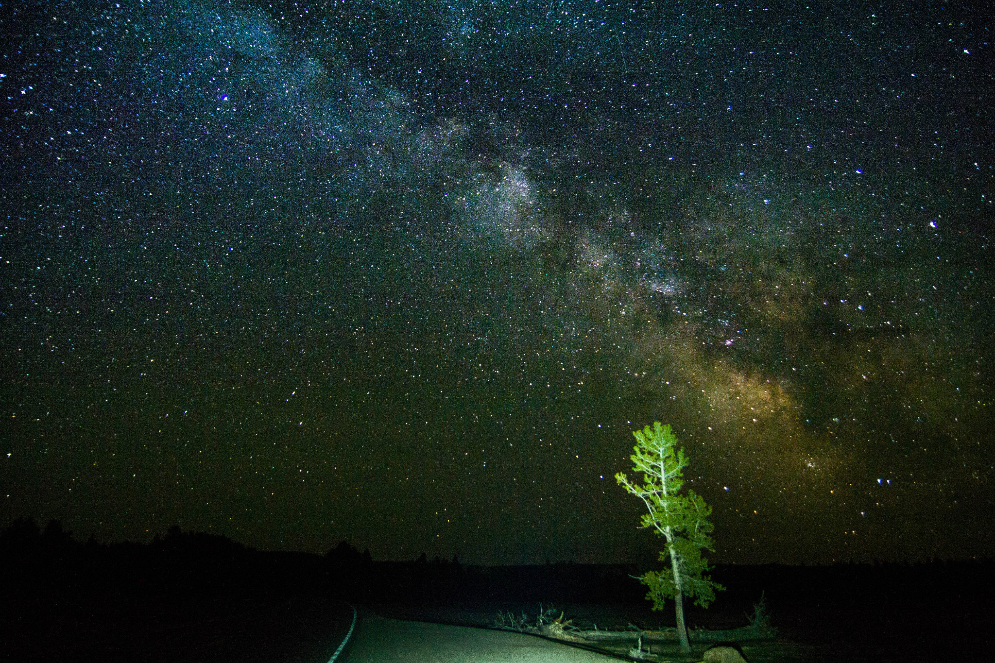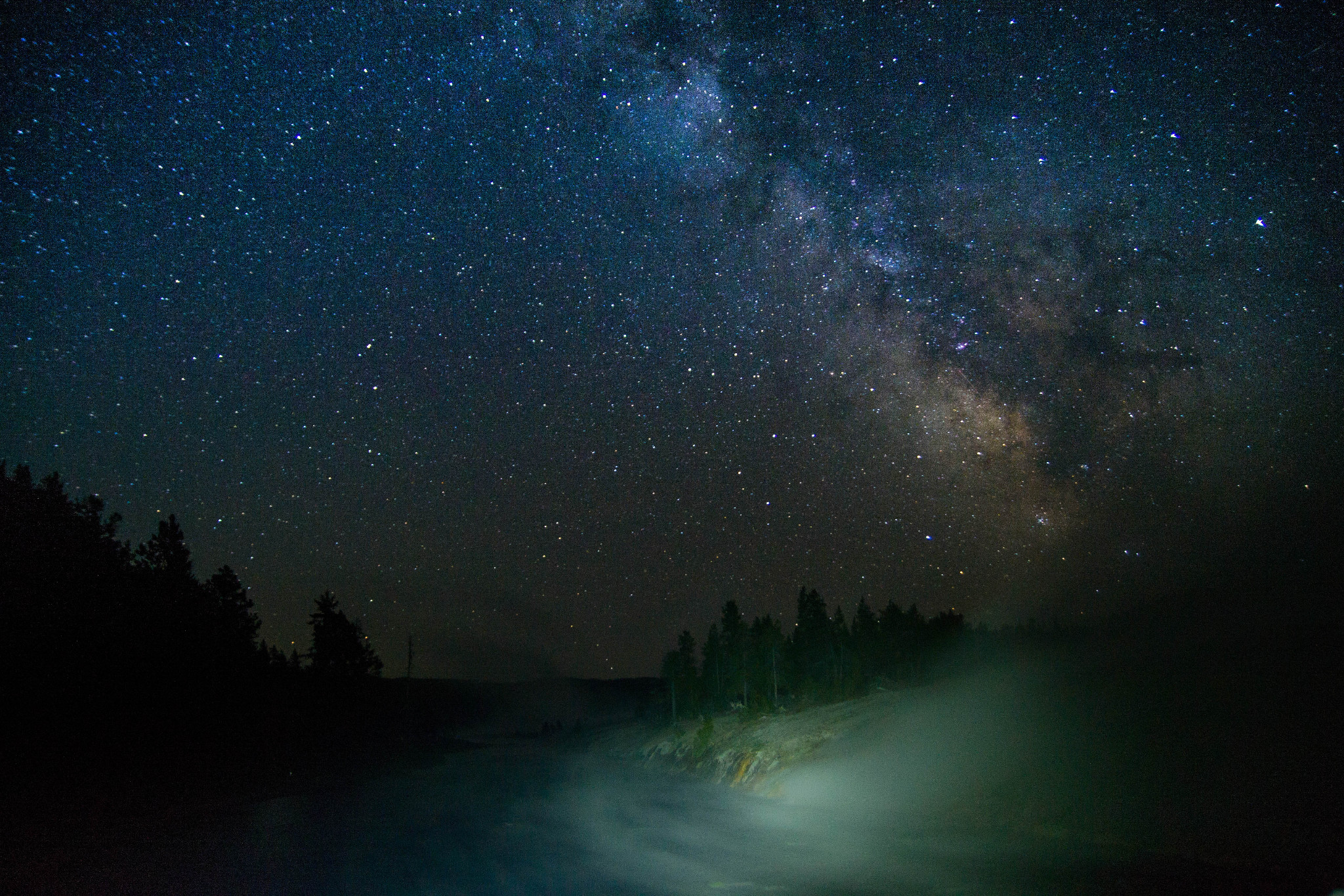 黄石公园内的光污染几乎为0,是绝佳的银河拍摄地。但黄石里的熊也是名不虚传的,经常会有熊在夜晚出动,在营地里翻垃圾桶找吃的,在野外就更说不准了。我们那晚住在黄石公园里的Madison Campground,凌晨两点出发往大棱镜(Grand Prismatic Spring)方向开。刚一离开营地的路灯开到开阔的公路上,漫天繁星立刻出引入眼帘。我们开了半个小时左右,到了公路旁的一个停车处。这是我们白天提前找好的地点,视野很开阔,有一颗树做前景。