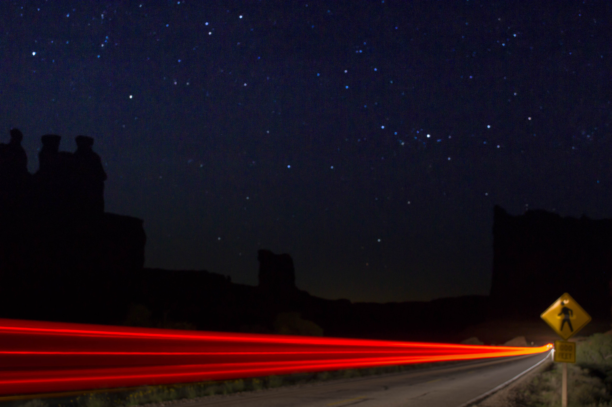 我们当时住在拱门国家公园附近的小镇Moab,从营地开到精致拱门停车场要五十分钟。考虑到银河在三点左右会升起,我们一点不到便出发了。最辛苦的还是司机师傅我本人啦,才睡了两个多小时就要起来开车,而小伙伴们都还在睡梦中。。。我开到了再叫他们起床。。。