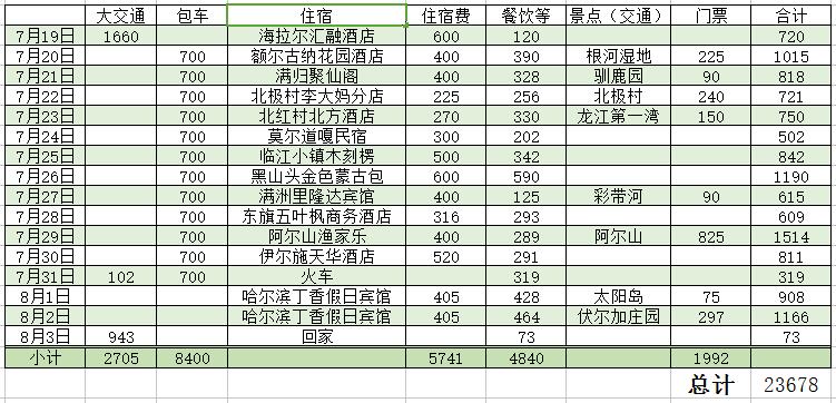 我们三人16天的行程,前12天包车在草原森林,后3天到哈尔滨,旅程的全部费用,人均8000元。