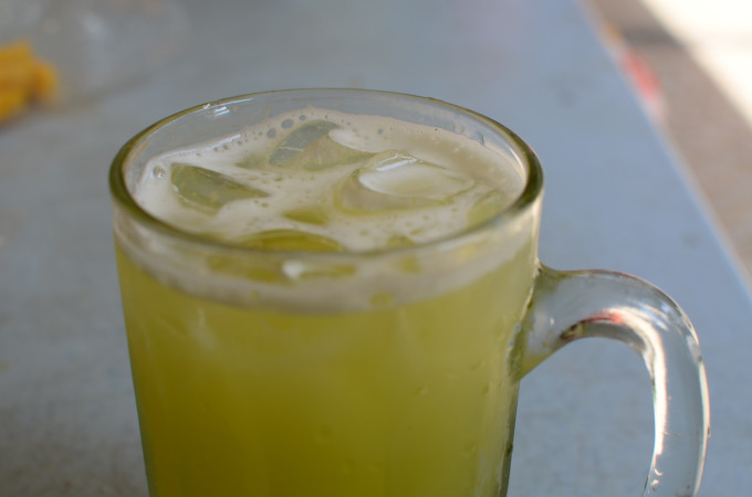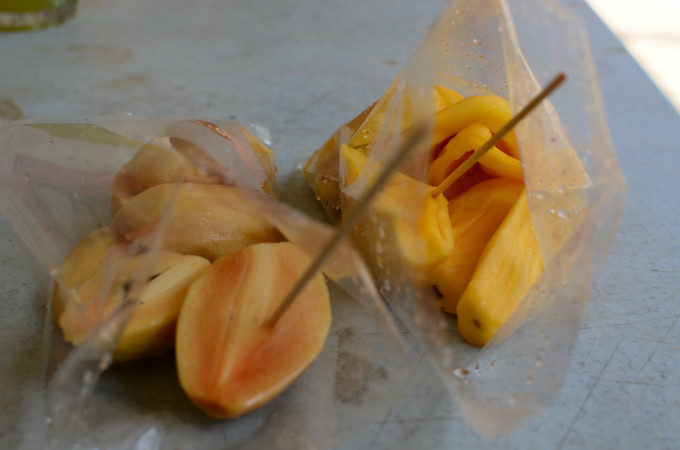 一家水果档卖的水果很新鲜,还有新鲜榨的果汁。