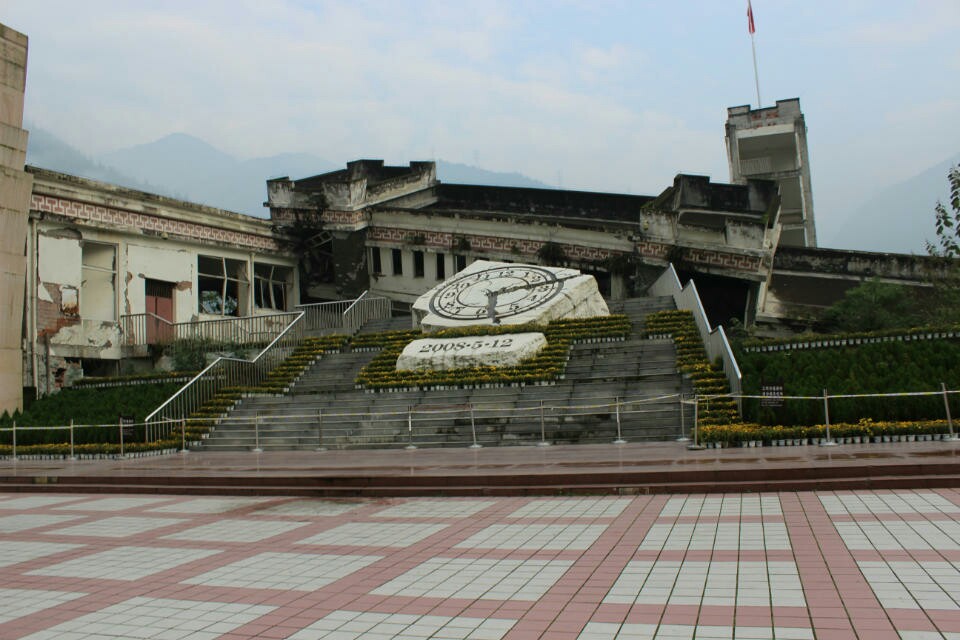 地震的遗址已经被圈起来当做景点,时钟则永远停留在5月12日14时28分04秒。