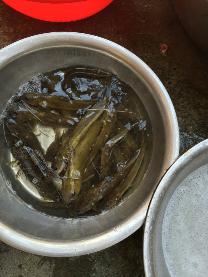 在这家小饭馆里,我们要了两斤角角鱼。老板在楼梯下黑咕隆咚的一个小水池里,捞了老半天,二十来条的样子,这种鱼平时要卖120元一斤,老板说便宜一点给我们110元一斤。