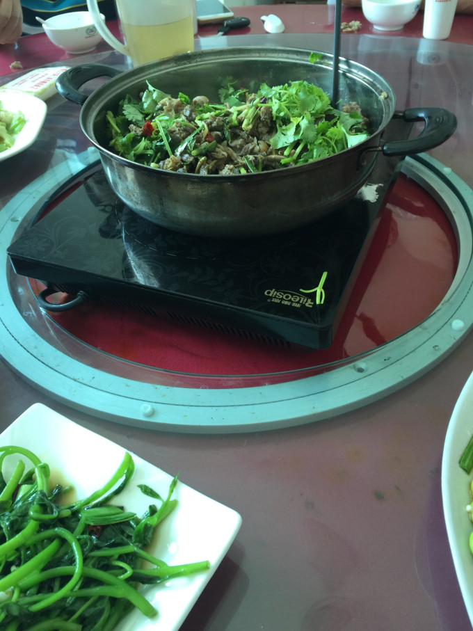 所以,在从江县城大街上再次看到这样的店,岂有不品尝之理?羊瘪汤干锅摆在桌子中间,还有我们点的其它几个菜。所谓的羊瘪汤,第一眼看上去就是羊杂加香菜之类的汤,酒精锅炉点燃,汤在干锅里慢慢煮开,其实羊杂之类在端上桌之前早已煮熟,羊瘪汤主要的奥妙在于汤。这种汤的颜色呈墨绿色的,喝一口非常苦,类似于苦瓜那种苦,就着酒及羊杂吃口味才好一点。