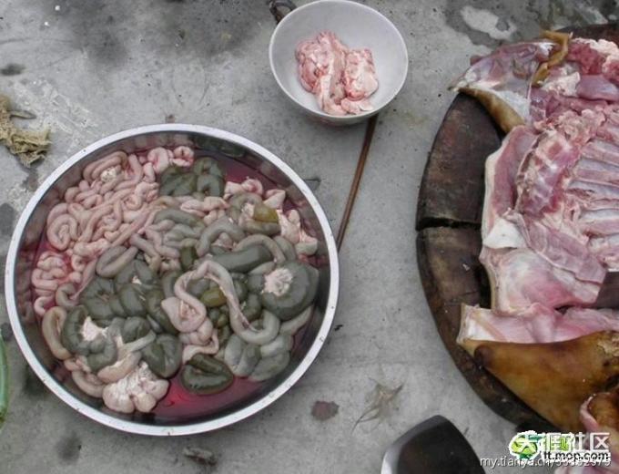 为什么叫羊瘪汤?除了羊杂之外,羊瘪是什么?我走进厨房,老板从冰箱里拿出一个大盆子,说这就是羊瘪。仔细一看,在我眼前就是一坨黑黑的小肠。说白了,羊瘪就是从羊胃出来,到大肠前的那一段肠子,即小肠的内容物。羊宰杀后,立即把羊的小肠剪断取出来,不加清洗,放在锅里炒干。据说,炒得越久,就越香。炒到后面,这小肠化了,加些羊肚、羊肝进来一起炒,然后开始加水熬。我想,羊的小肠主要作用是消化吸收食物营养精华,进入大肠后那些草已经是消化后的糟粕,也即是真正意义上的屎。而在小肠这一段里的东西,除了羊吃下去的碎草,还含有丰富的消化酶,比如胃酸、胆汁等。(下图一:干锅里的羊瘪汤;下图二来自网络)