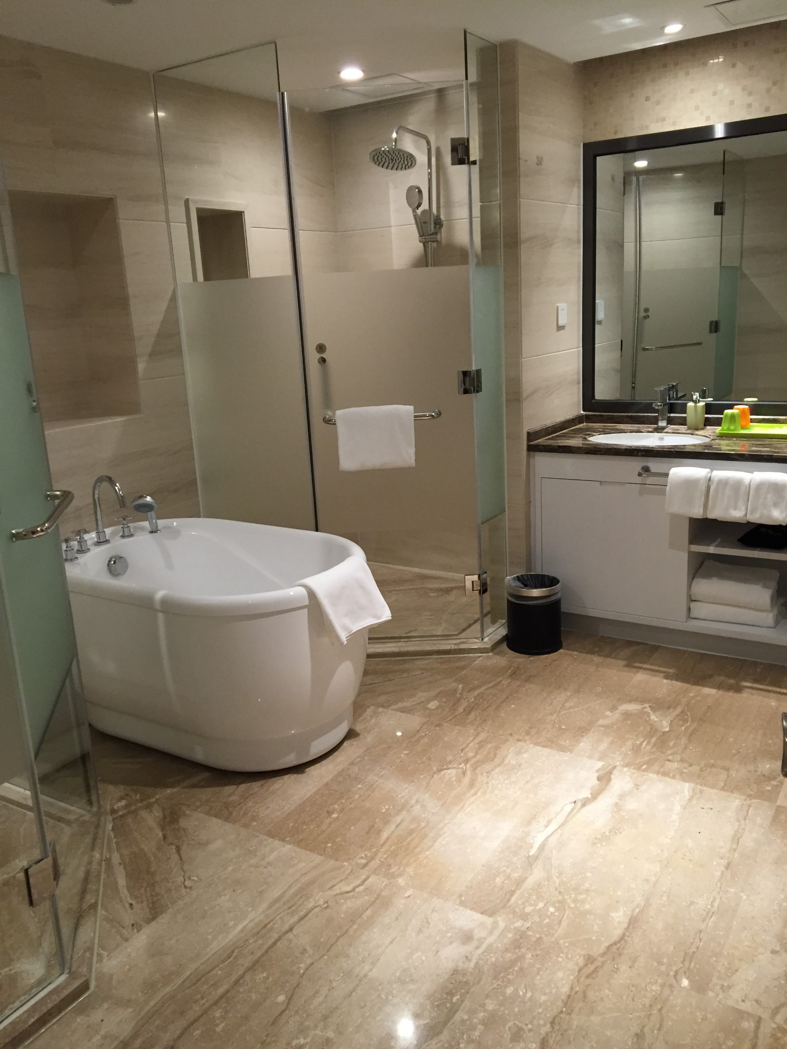 最让我喜欢的是房间的卫生间,光看照片就很大有木有!!!还有一个小浴缸正对着落地窗,晚上可以一边泡澡一遍看夜景哦~