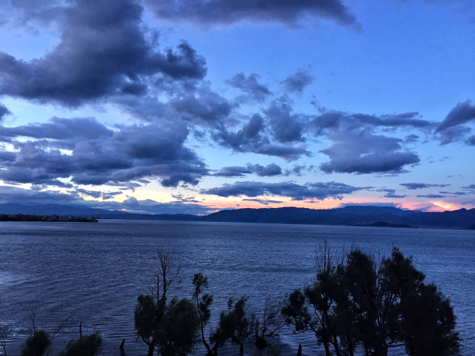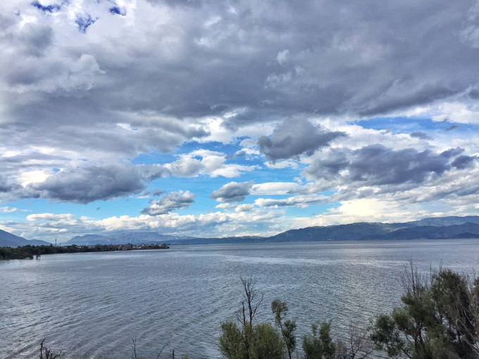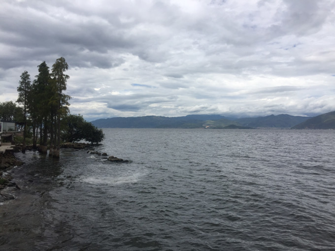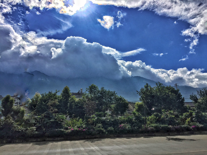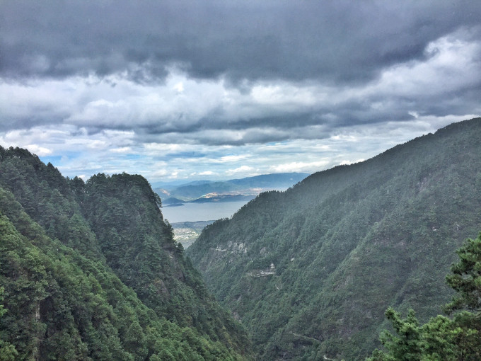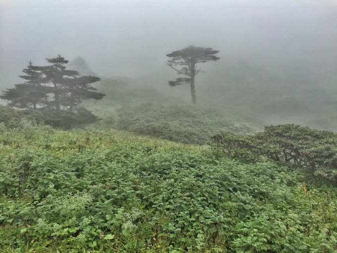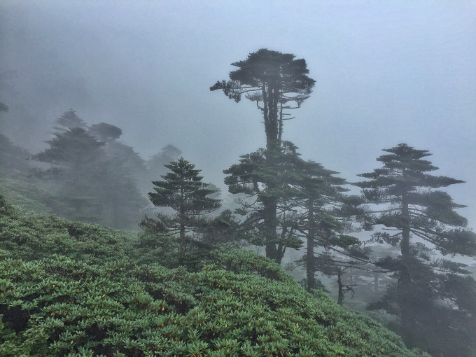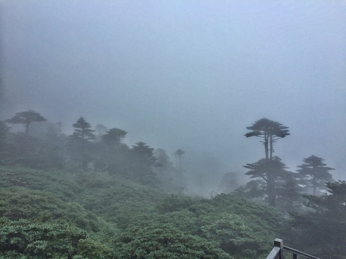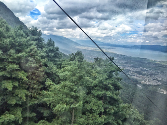 2.这是淡季,所以缆车基本不用排队,两次缆车后很快就上了山顶。沿途风景很美:山脚一眼能望见古城大理;山腰河流、山麓、松柏数不胜数;山顶迷雾一片,最美的是山上的松柏,迷雾中它们就像盆景里的景物。(如图)