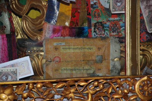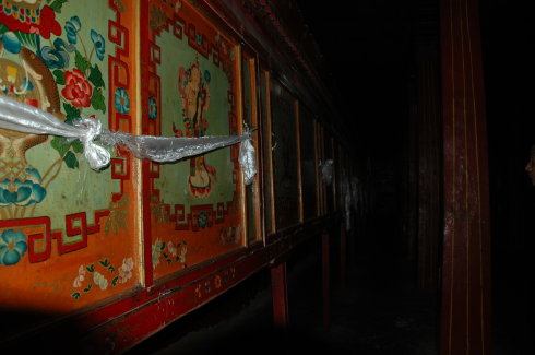 哲蚌寺里还有很多金碧辉煌的殿堂,受篇幅限制我就不把照片都贴上来了。不过在参观寺庙的同时,也略有些遗憾。一是本来古色古香的寺庙里,由于用电的需要立了不少电线杆子,上面走的是普通的明线,这与整个寺庙的气氛很不协调,尤其是拍照的时候更是让人不得不左躲右闪。我问了问,这居然就是我们以前工作的结果,这使得我这个当局长的有些哭笑不得,其实用电与寺庙完全可以结合的更天衣无缝一些。还有一个就是在参观的过程中,我在一面墙上看到了熟悉的标语口号,不知是没有顾上粉刷还是有意在提醒我们,这也不禁使我感到也许今天的哲蚌寺已经少了很多当年的韵味吧。