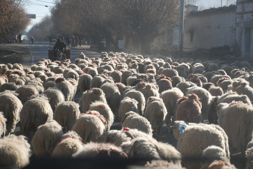 羊群悠然前行,丝毫不理会我们的到来,也许马路该改名叫“羊路”才对