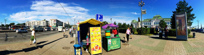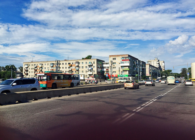 在 Vitas 的 “马大叔与小舅舅” 歌声中,飞机降落在海参崴机场,出门乘坐 107 路小巴,道路通畅的情况下开了一个多小时才到市中心。我们住的地方在中央火车站附近,当初订在这里就是看中了那个 “中央” 一词,结果到了之后才发现,所谓「中央火车站」虽然在市中心,却也并不处于城市最繁华的中央地段,其尴尬的位置倒是有点儿像北京火车站附近的东便门 —— 虽然身处二环内,但附近却啥也没有,得步行一站地到崇文门才渐渐热闹起来。