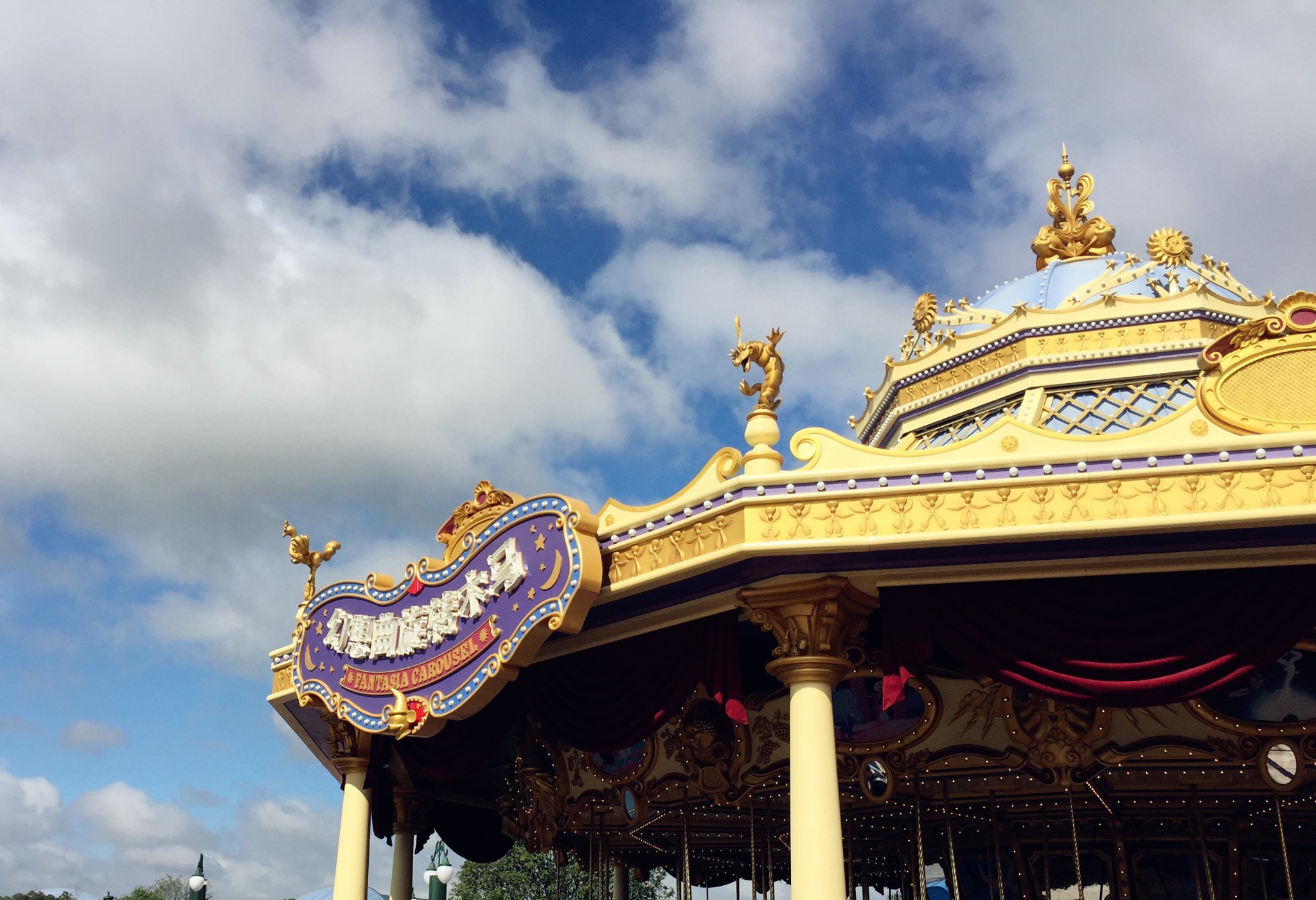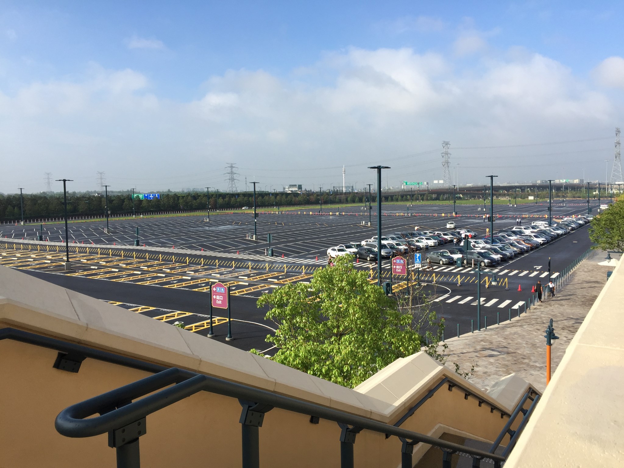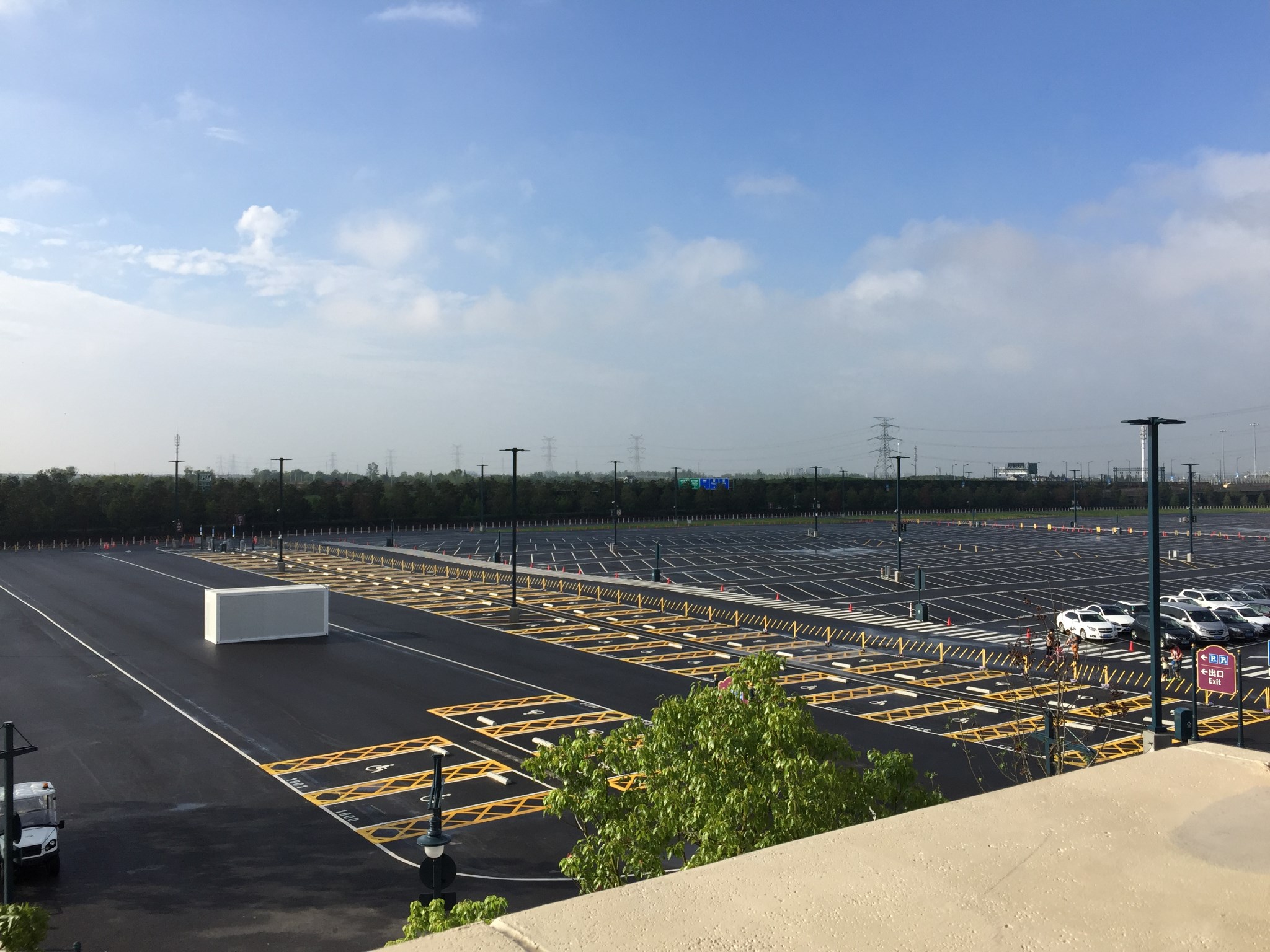 路上天空还飘着零星的雨滴,到达迪士尼停车场,蓝天、白云、阳光全到齐了。