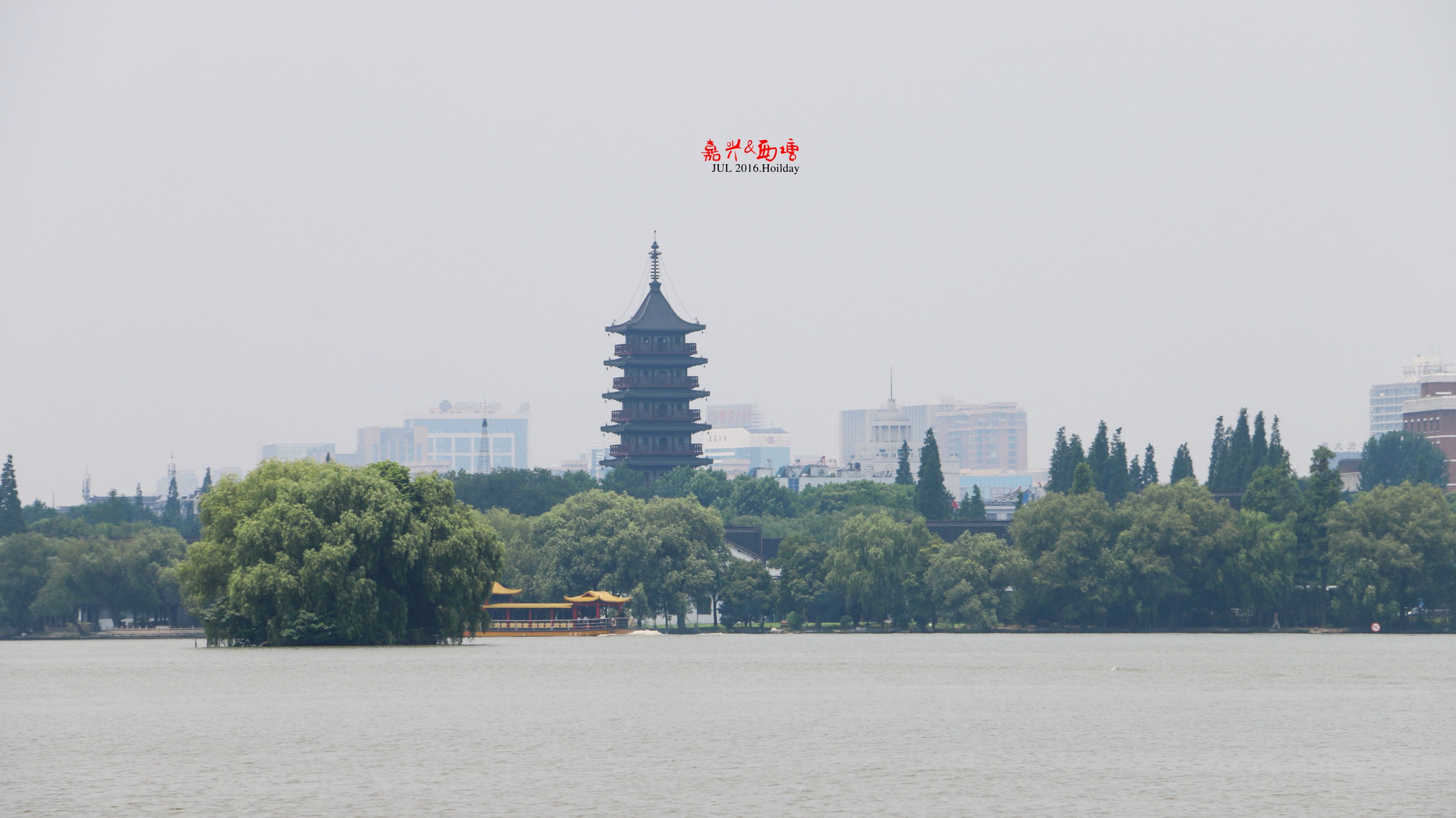 船向湖心岛而行,湖心岛即烟雨楼。只是今天艳阳酷热,少了传说中云笼雾罩的意境。