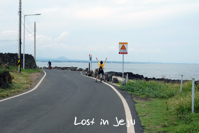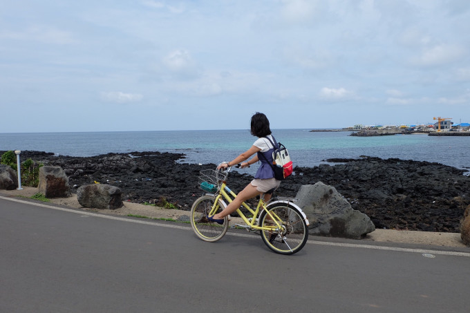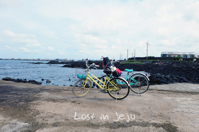 上岛后两种选择:搭bus绕一圈在固定四五个景点可以下来拍照;自己租车(自行车/电动车/摩托车?)或步行环岛。我们当然选择了自行车,3h以上租车费用10000韩元/辆,需要留下1本护照等还车时换回。柠檬黄与薄荷绿,我们就是这么千!!!!车儿骑起来在拐弯处那么一作,感觉自己是上天,哈哈哈哈。