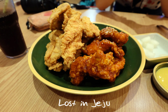 点评上搜到了莲洞的“荡荡炸鸡”,离酒店很近也好找,门口有只缺了一只脚的鸡。一份双拼鸡(一半调味一半脆皮),总的来说味道很一般,调味比脆皮好一点,加两杯可乐价格大概16500韩元,两个人完全吃不完打包了一半回酒店(虽然最后也没吃)。