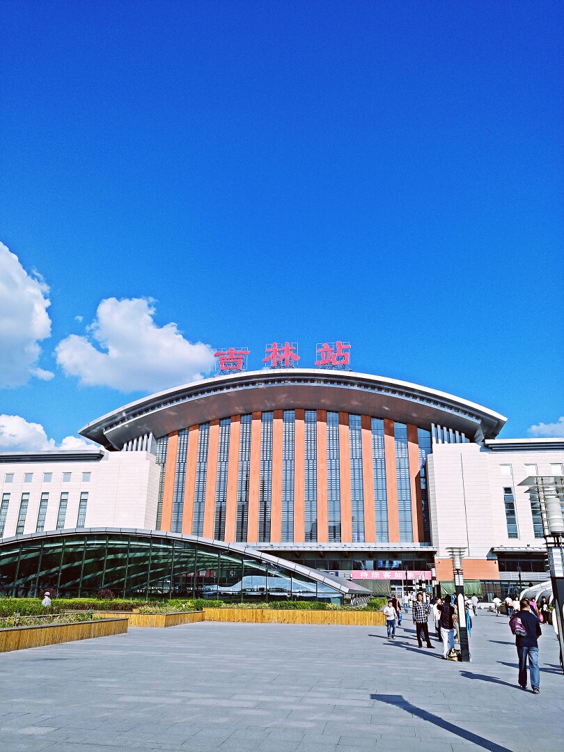 到吉林落脚纯属担心航班晚点不想着急赶路才住一晚,所以也没有任何逛吃的计划安排。一出吉林站,蓝天白云刺眼的阳光就来了!跟天气预报的下雨低温完全两码事!穿短袖足以!可怜我只带了一件短袖,其他都是秋装。