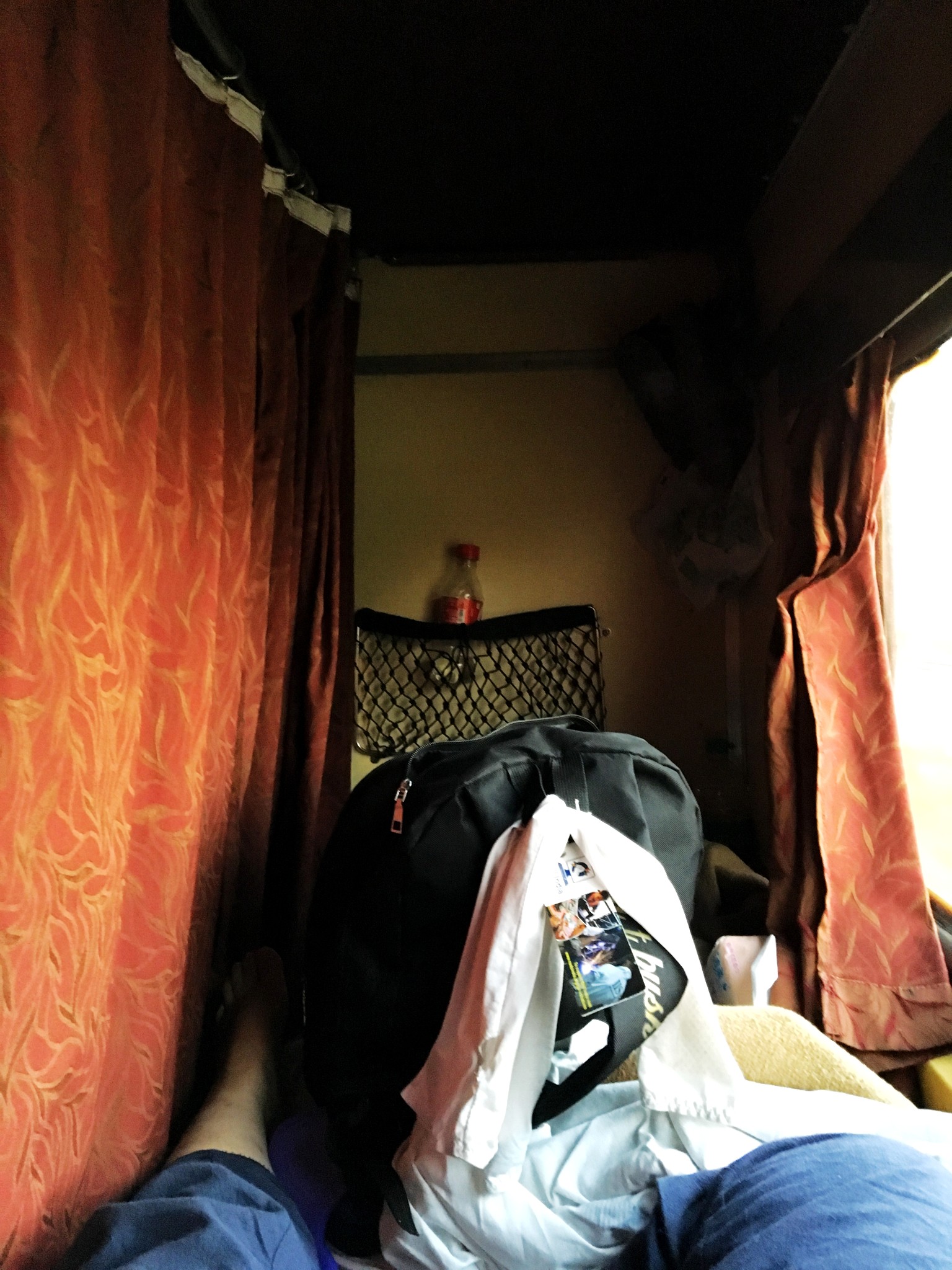 他们一个车厢是有6个床位,靠走道的是最后两个数字,说实话,这两个铺位很鸡肋,除非你是很注重个人隐私的人,不然我真心不咋推荐这两个位置的铺位,原因:① 这两个铺位要比另外四个床位窄1/3,走道铺位的宽差不多就和我最大的包差不多宽,我一共两个包,放了包后,基本就没我啥事了。② 刚睡的时候还好,但到后半夜,有人中途下车,走道铺位上铺还好,我住的下铺,只要有人下车,我绝对会被行李撞醒而且很吵,最开始心里还有点冒火,后来次数多了,被撞醒后翻个身接着睡,③ 火车上中途会有人检查,因为在做攻略的时候说过火车上有掉行李的情况,所以被检察人员中途吓醒了好几次,有一次一人掀的是我头这边的帘子,我睡得半混半熟的突然看见有人在看我,wk,姐我瞬间被吓醒,哪一刻我想杀人的心都有了。