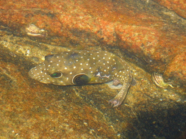 偶然在礁岩的水坑里发现的这条鱼,估计是被浪冲上来的,被大太阳晒得都已经快晕过去了:)