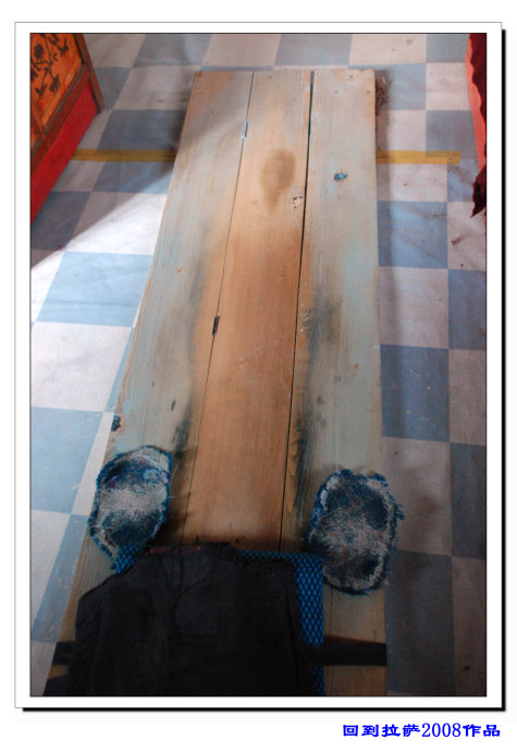 相信很多朋友都应该知道,这是一块信徒用来磕长头的木板。中间是人五体投地时用来垫在身下的,边上两个类似拖鞋的东西是套在手上的。磕长头在西藏是很常见的,尤其秋冬季,不仅在大昭寺门前聚满了磕长头的信众,而且从林芝以及西藏其他地方边磕长头、边徒步前往拉萨的信众也很多。每次见到这种执着的长头,都会不由自主被他们的精神所感动。而今天,虽然没有看到这种场面,心头却也充满了一种感动,仅仅从木板上一个人形的身影,你就能想象这需要多少人、多少次的匍匐、常跪才能形成这样的印记呀!信仰的力量就被这样一块默默不响的木板诉说的再清楚不过了!