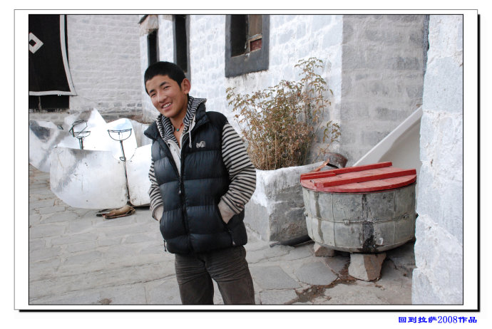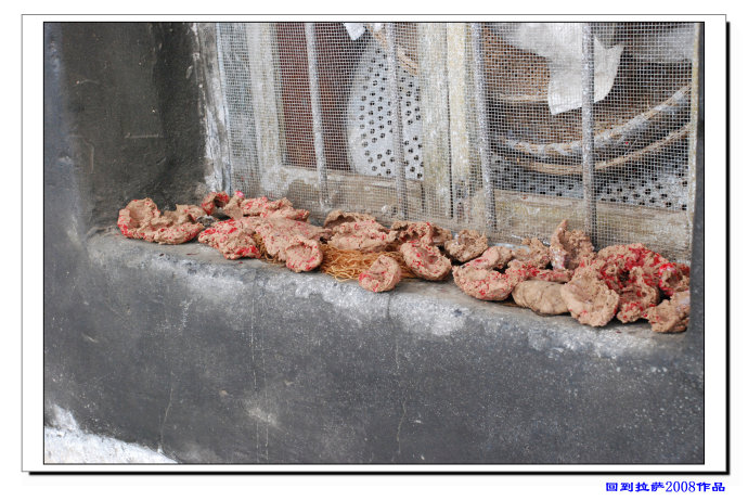 好奇的看着院子里的各种陈设,我们一步一趋的渐渐向院落的深处探寻,虽然刚才牧羊女说这里可以参观,但一个人都没见到,还是让我们不得不谨慎一些,毕竟我还没进过尼姑庵呢!正在此时,忽然听到一阵脚步声从院子深处传来,还没来得及多想,就迎面蹦出了一个普通装束的小孩,年龄也就是十六、七岁的样子,可我怎么看这也应该是个小小子呀?莫非这尼姑庵里也有小伙子帮忙干活?正打算和他交谈几句,身后又走出一个僧人装扮的小伙子,这下我算是明白了,这肯定不是个尼姑庵。通过和他们的交谈,我搞清楚了,原来这也是个日追,朋友们应该还记得吧,日追就是比寺庙规模小的修行之所。这个日追里连僧人和工作人员一共有十七、八个,最开始出来的小伙子就是这里管做饭的,修行尚浅还不够做僧人。而这里也绝没有什么女僧人、更不是所谓的尼姑庵。之所以被误解,我琢磨了一下,可能是和这个日追的名字有关,这个日追叫“格桑日追”,格桑是花的名字,以讹传讹就被认为是个尼姑庵了。可见就算是当地人估计也没几个真正来过呀!另外,我还搞懂了,上面照片里窗台上晒的的确是糌粑制作的,主要是用来给山上鸟儿享用的,呵呵,知道僧人是多么博爱了吧!