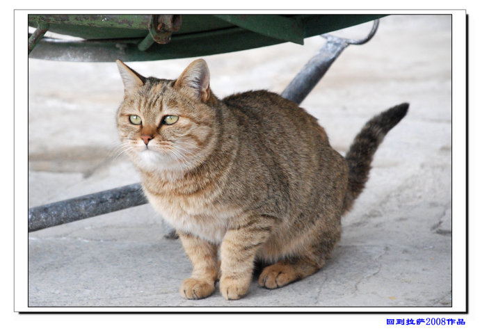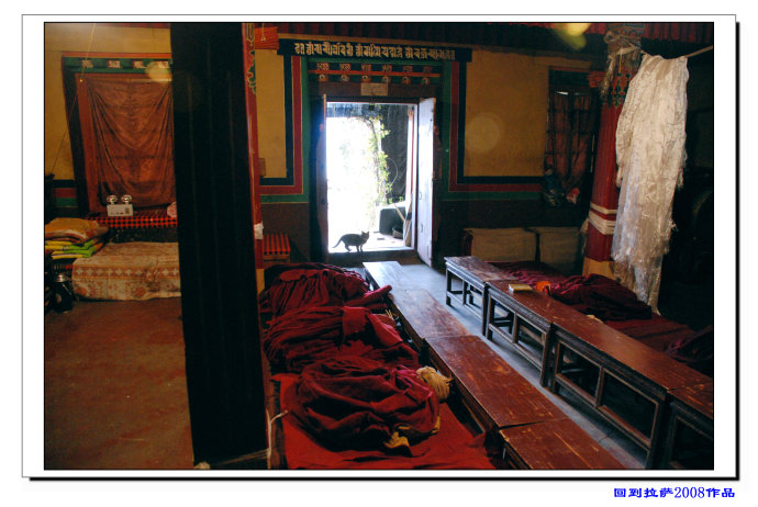 僧人友好的和我们打了个招呼就匆匆离开了,陪同我们参观的任务就交给了小伙夫。小伙夫是安多人,来寺庙的目的就是将来要做一名僧人,他的汉语很一般,但态度却很热情,带着我们走进了日追里唯一一个殿堂、也是僧人们平时修行之所。殿堂很小,中间供奉着莲花生大师的造像,四周挂满了古色古香的唐卡,在一个小角落里居然还有酥油花,看来制作酥油花应该是僧人们必须掌握的技巧呀。听别人说,西藏寺庙里的小动物都是有灵性的,尤其是猫,好像也是一种神灵的代表,这次碰到的这只就很有些意思,不仅模样和我小时养过的很相似,而且自从我们一进来它就一直好奇的跟着我们,等我们进了殿堂,它也不忘了在门口守候,不知是喜欢、还是在监视我们。