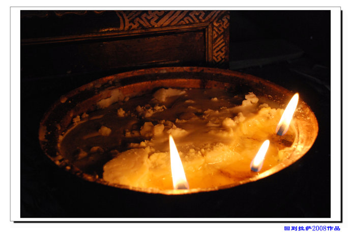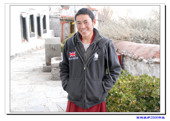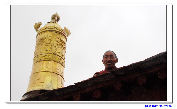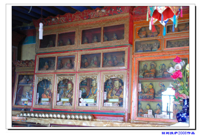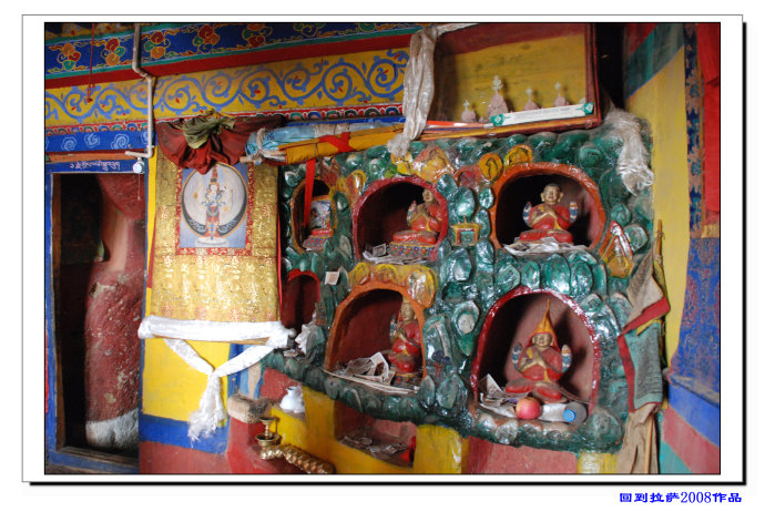这座寺庙虽然非常的狭小,不过通过僧人的介绍方才知道,这里有着古老的历史和让他们骄傲的过去。当年格鲁派创始人宗喀巴大师正是在这里写下了他的代表作之一的《菩提次第广论》,奠定了格鲁派的教义基础。至今在他当年写作的小屋里还有他的画像以及他的一个手印。我们在僧人的带领下特意参观了这个小屋,这个小屋小到只能容两三个人站着,想躺下都很难,真是可以想象当初宗喀巴大师是在怎样一个条件中、在怎么样一个精神的支撑下写下这部著作的。这也才是真正的修行呀!出于尊重我们没有照相,只是和大师比了比手掌,看来这大师不光修行高,手掌也不小呀!