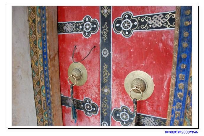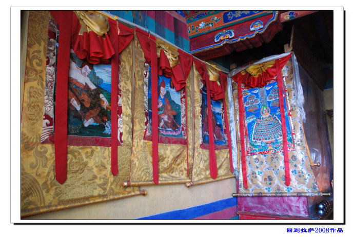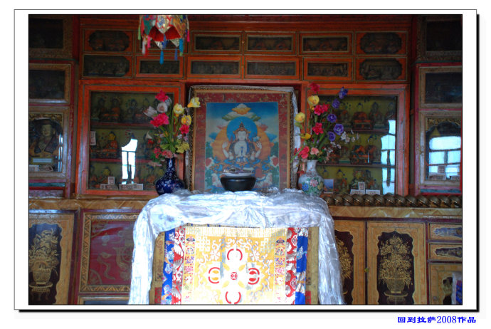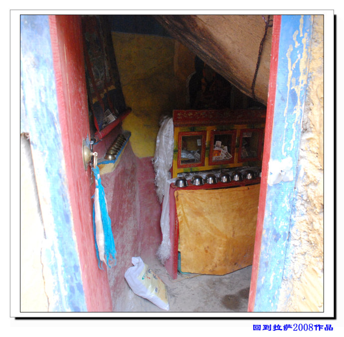 这下可有点麻烦了,也许是僧人外出把门锁了。可怎么琢磨也不明白怎么从里面锁的呢?要是换在平时,实在进不去也就算了,可今天一路都挺顺利却在这儿给挡住了,总有些心不甘,再说这么高都来了,不看一眼太遗憾了。反正也没人,于是我就试着推推、拉拉,看看有什么奥秘。终于,机关被我发现了!朋友们注意到门环上类似拉手的铁丝了吗?这原来就连着里面门闩的把手,轻轻一拨,殿堂的大门就被打开了。走进殿堂,虽然同样不大,但四周墙上却挂着很多漂亮的唐卡,吸引我驻足仔细欣赏。