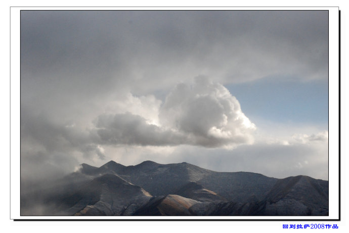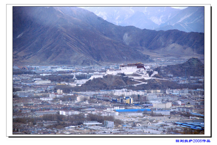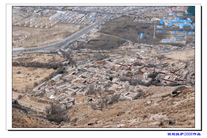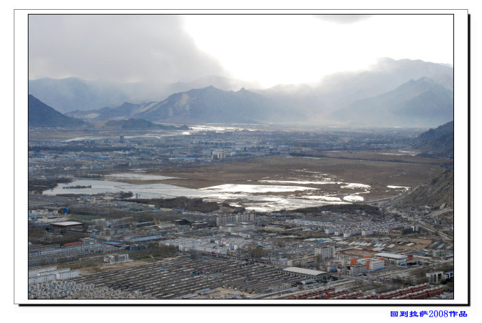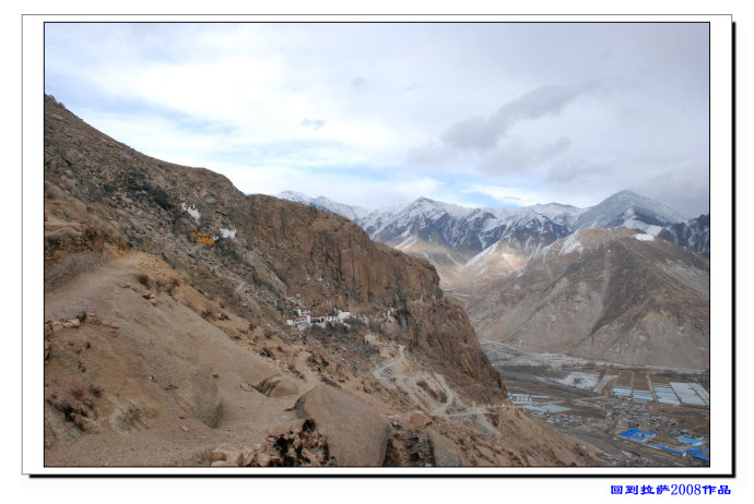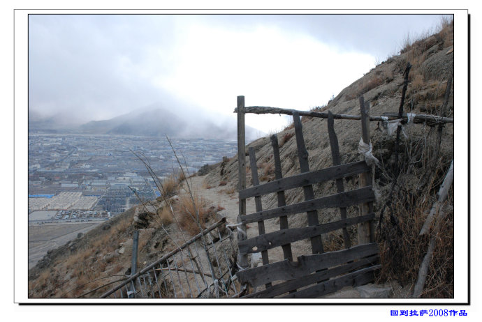 推开虚掩的柴扉,我们兴奋的踏上了通往色拉寺的小路。虽然小路很狭窄,但由于僧人们来往频繁,所以非常平整好走。而且起伏不大,比起刚才的上山不知道要轻松了多少。顺着山势前行,逐渐绕过了一道山梁,而此时整个拉萨一下子跃入了我们的眼帘,从没有这么居高临下看过自己已经居住了一年多的城市,心中顿生一种自豪,看来今天登山的决定真是对了,否则怎么可能欣赏到如此美景呢!而此时的拉萨正被乌云笼罩着,似乎蒙上了一层略带羞涩的面纱。昔日在城市中威武的布宫和红山,此时已经成了一个小山包,青涩的站在那里,一副不知所措的样子。而曾经让我花了好几个小时、绕了一圈也不能看清全貌的拉鲁湿地,这个时候大大方方的展示了美丽的身姿,即使是乌云当头,也盖不住她如镜一样平静宽阔的水面。再看附近的山上却是或明或暗,不时有阳光穿透云层,点亮起一片片山峰。我们所在的山坡也是如此,虽没有阳光明媚,却也跳出了城市上空的乌云,颇有置身云端的感觉。如此画面,真好似仙境相仿呀!再回头望望刚才的寺庙,他们重又变得模糊起来,再次恢复了那曾经的神秘。