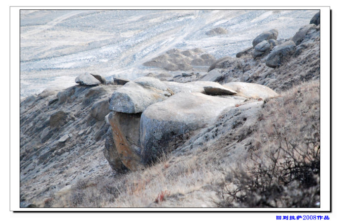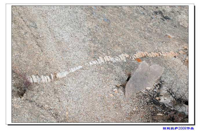 其实不仅山下的风光旖旎,我们一路上的山景也是不错。不仅路旁有形似智者的巨石相伴,向上望过去,山峰陡峭,别有一番风韵。而且还经常能看到破石而出的灌木坚强的挺立着;离我们不远的山头,也不时有经幡随风飘扬,看得让人赏心悦目。另外,我还发现在道路两侧的山坡上,经常会有一道白色的线条,仔细看过去,居然是一些碎石有规律的连接而成,颇似人雕斧凿之作。琢磨了半天也不明所以,估计是山体风化的结果吧。大自然总是这样神奇,总会有些让人琢磨不透的作品。