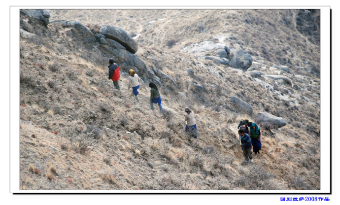随着色拉寺的临近,我们的注意力渐渐从风景中移开了,因为还有另一个目标需要我们去发现和寻找。就在此时,一阵歌声伴随着一队藏人从山下飘了上来,走近一看,原来是正在整修山路的人们。他们一边唱,一边有节奏的铲土、夯实,喜悦之情很快就在山坡上传播开来。见到我们走来,他们也纷纷停下手中的工作,和我们打起招呼来,见到相机还主动要我们给拍照,没有丝毫的陌生。通过交谈得知,他们是应色拉寺的邀请前来修路的,已经干了一段时间了,很快就要完工了。当然说起这些,他们保持了藏人为寺庙工作而特有的那种高兴和自豪。谈笑间,天色已晚,他们也到了收工的时间,我们一同有说有笑的沿着山路一直下到了色拉寺。再次来到色拉寺,居然是有种从天而降的感觉,好似重又回到了人间!