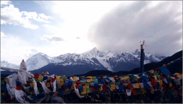 去梅里也是在这次旅行中的突发奇想。由于非典,云南各地的旅游接待都陷于停滞。正是在这种状态下,经过数道检查关口,翻越了白芒雪山垭口,我坚持义无反顾的前往梅里。此前对梅里的了解仅仅限于《旅行家》杂志一篇叫做《忘情滇西北》的文章,文章中流露出对梅里雪山的无限敬仰深深勾起了我一探究竟的欲望。随后的一天,伴随着一路颠簸和高原炽烈的阳光,傍晚时分,当雄壮的梅里雪山太子十三峰在夕阳映衬下如同十三座身披金甲的勇士,在我已疲倦不堪,最不经意间呈现在我面前时,我已不能用任何语言来表达我内心的激动,跪倒在它面前时早已泣不成声、、、、、、