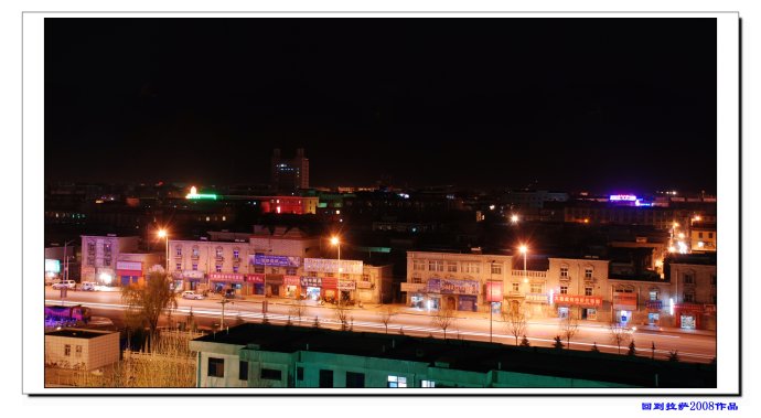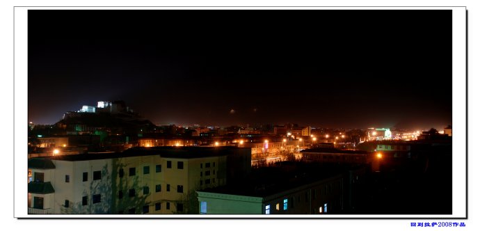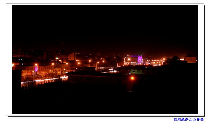 就在这欣赏的同时,一个念头突然闪了出来。来了这么久了,好像还很少拍过拉萨的夜景呢!我们的办公楼有5层高,这在内地肯定是不算高,但在拉萨,我前面说过,由于有布宫高度的限制,因此这就已经能看出很远了。守着这么好的条件,干嘛不到楼顶去拍拍呀。再说,我这脚架、快门线都买了一阵了,正好可以练习一下夜景的拍摄技巧嘛。打定了主意,就找了一个空闲的夜晚,我带齐了家伙式,来到了楼顶,于是有了下面这组照片。由于是初次尝试夜景拍摄,所以效果就请大家包涵了。