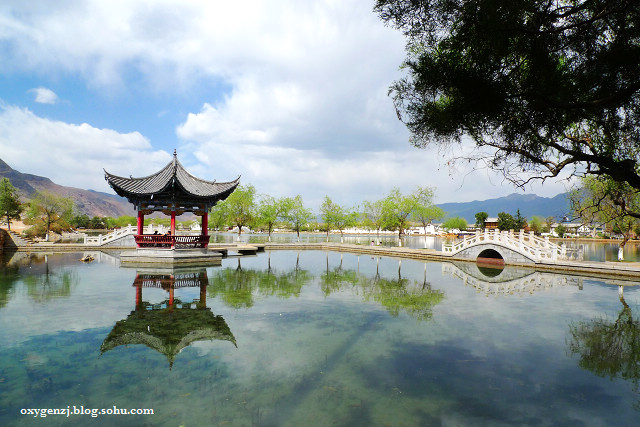 新华村排列有序的白族民居、古色古香的石桥、高低不平的石板路,衬托出高原水乡的秀美。青瓦、白墙、蓝天、碧水、青山及美丽勤劳的白族儿女,正是这高原水乡的灵魂。走马观花似的浮光掠影,在心中已然留下了一片惊鸿,滇西北 高原上的银都水乡,我想我还会再来。