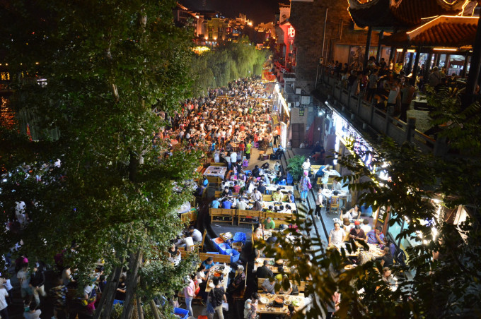 人们可能下午都在休息为了晚上大快朵颐做着准备....在河边的酒吧街和夜宵街,简直就是众众众众....众众众众....众众众众....人山人海.....都在吃烤鱼和酸汤鱼...有那么一条街店子的招牌上全部打着“舌尖上的中国”栏目推荐,看来。。。。真的是。。。。太好吃了....