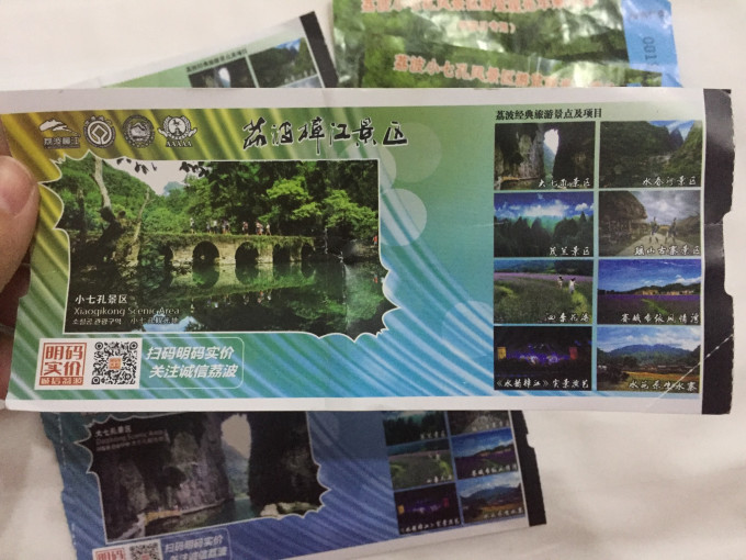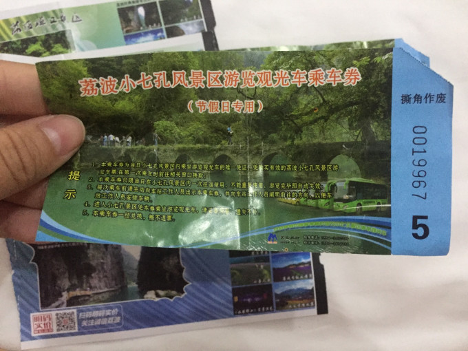 回房休息前,正好在楼下碰到民宿老板娘,老板娘很善意地提醒我们,让我们去小七孔早点出发,说是4日那天,小七孔景区中午就因为人满为患不售票了。于是5日一大早7点我们在镇上一人吃了一碗贵州羊肉粉,就匆匆往小七孔景区开,果不其然,一大片停车场已经停满了车。等停好车到小七孔西门的售票口,发现排队的人已经排到了50米开外,而且动的很慢。这个时候多亏了美团,我在美团上订了3张178元的票,包括小七孔景区门票+小七孔景区内接驳车+四季花海门票。在电子兑票窗口大概排了30分钟队伍就兑换到了门票,顺利进入了小七孔景区,登上了景区内的接驳车。