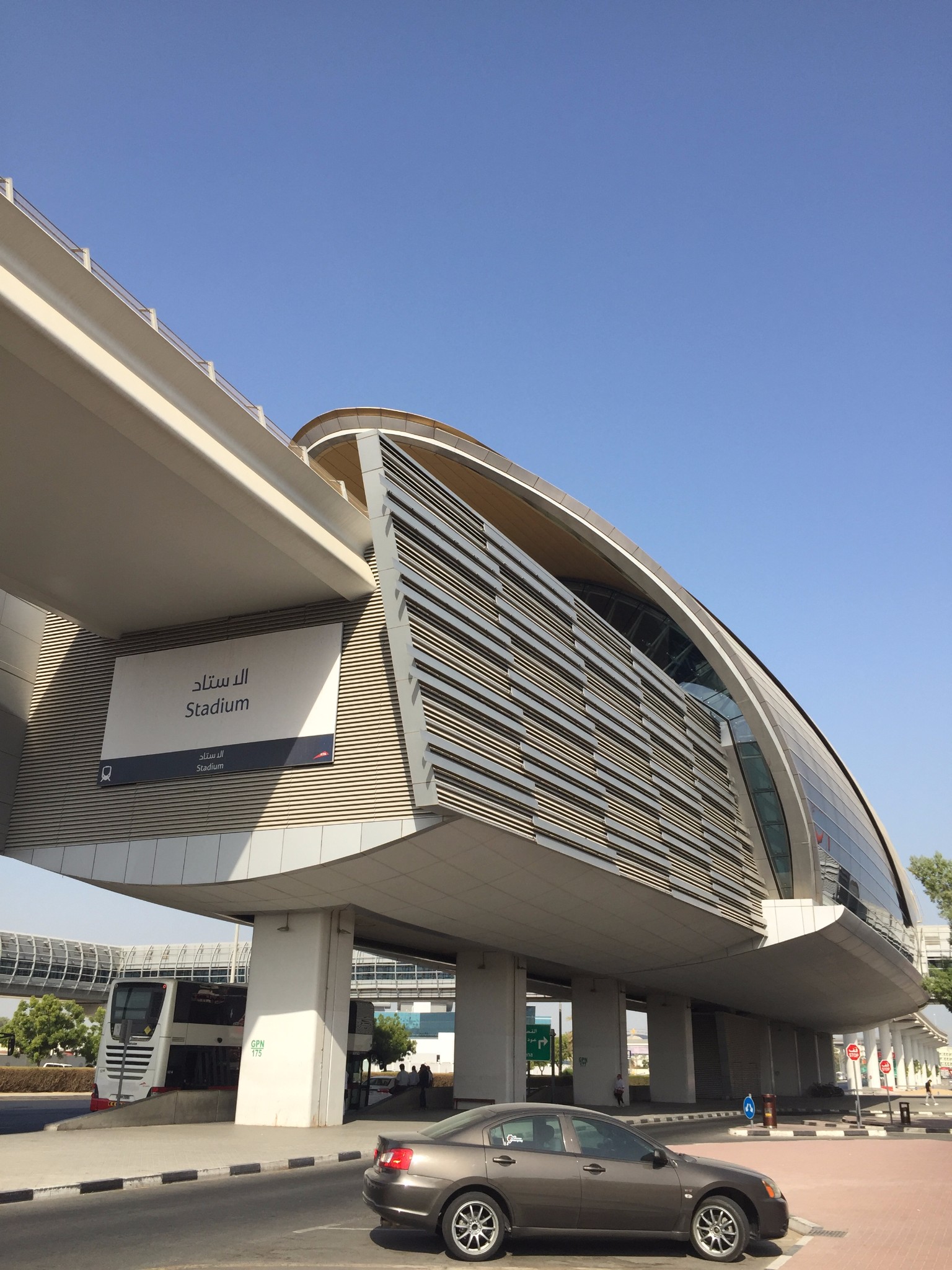 迪拜的公交车站都是全封闭的,半月形的小玻璃屋子,里边可以看到最近的十几趟公交的到达时间,有的还有充电器和卖冷饮的小柜台,门一拉开就会有大功率空调把冷气补进来