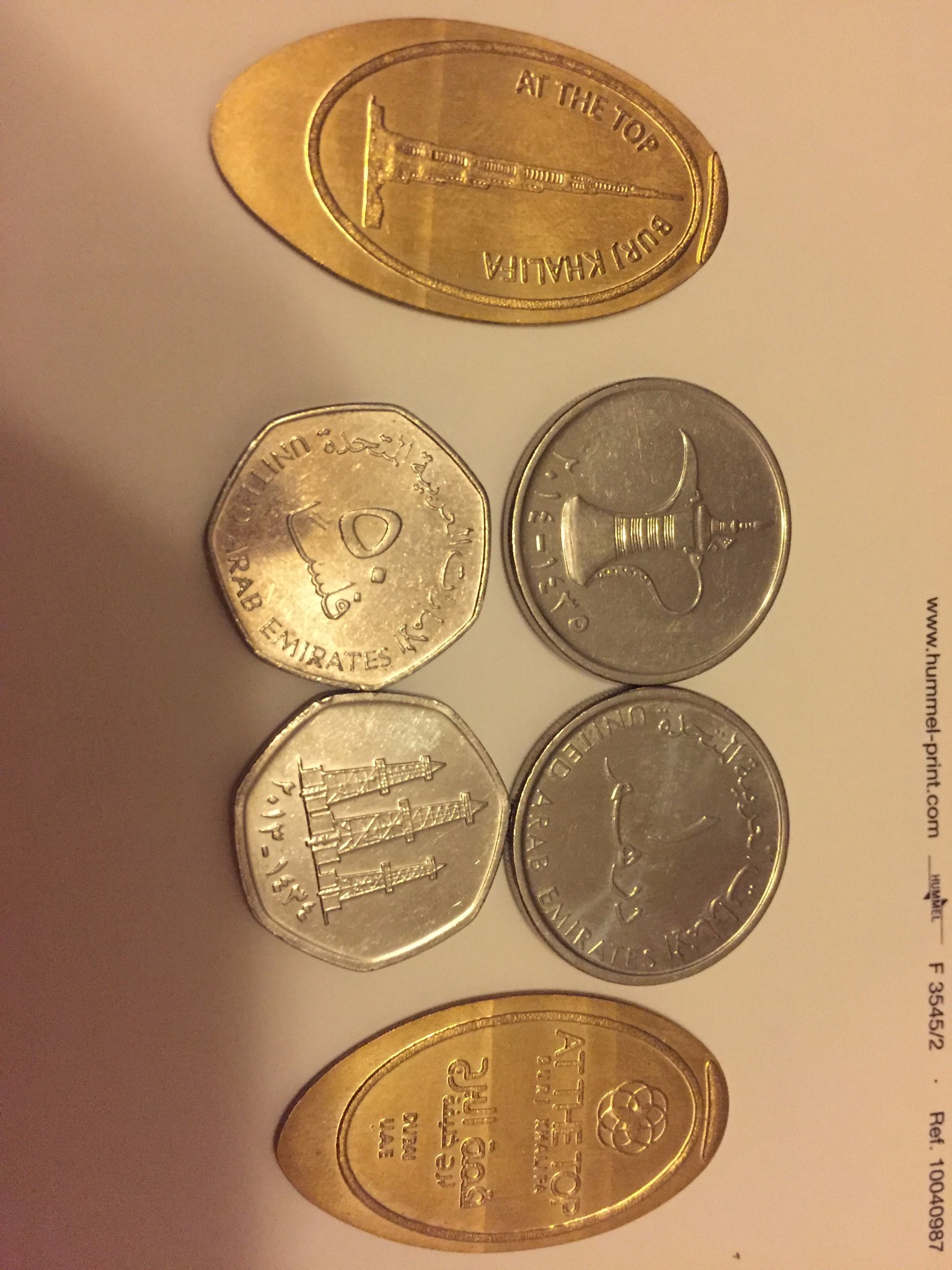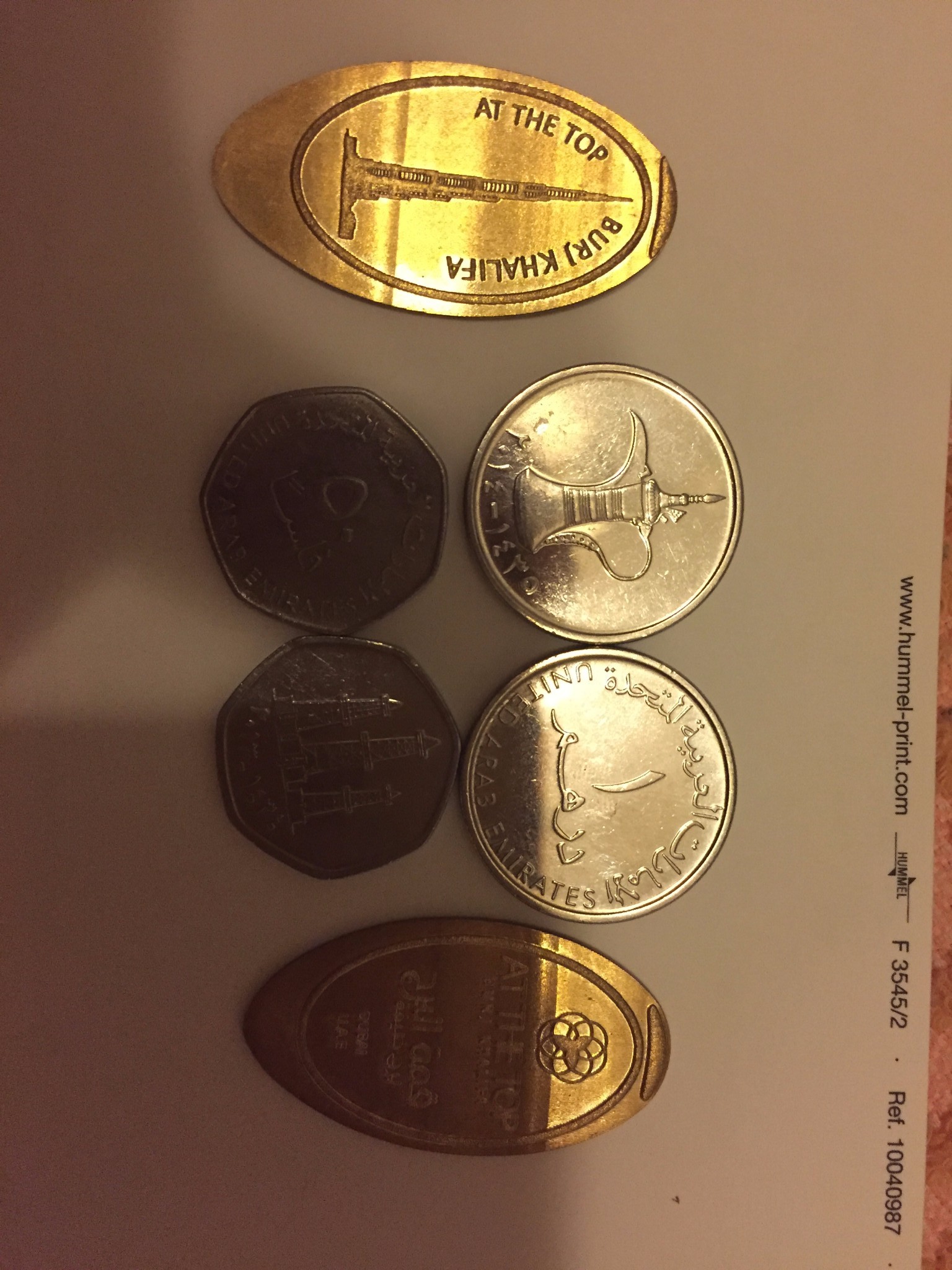 银色的是硬币,上边画的不知是何物,很想阿拉丁神灯,金色的是在迪拜塔上用手工制币机做的,亚特兰蒂斯也有,一个大轮子自己徒手转半天,小纪念品