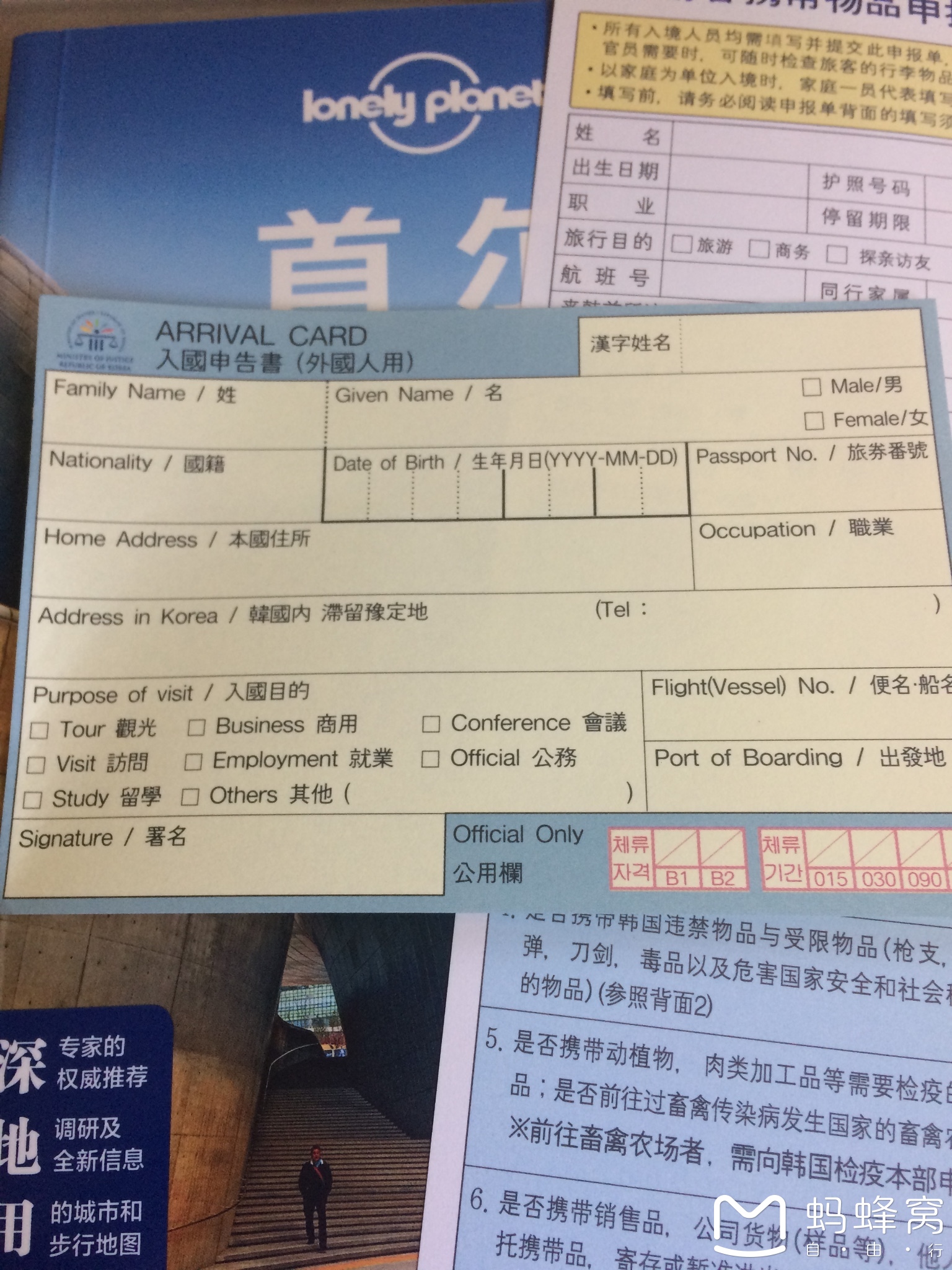 在飞机上记得填好这两张单子,全部用英语填写
