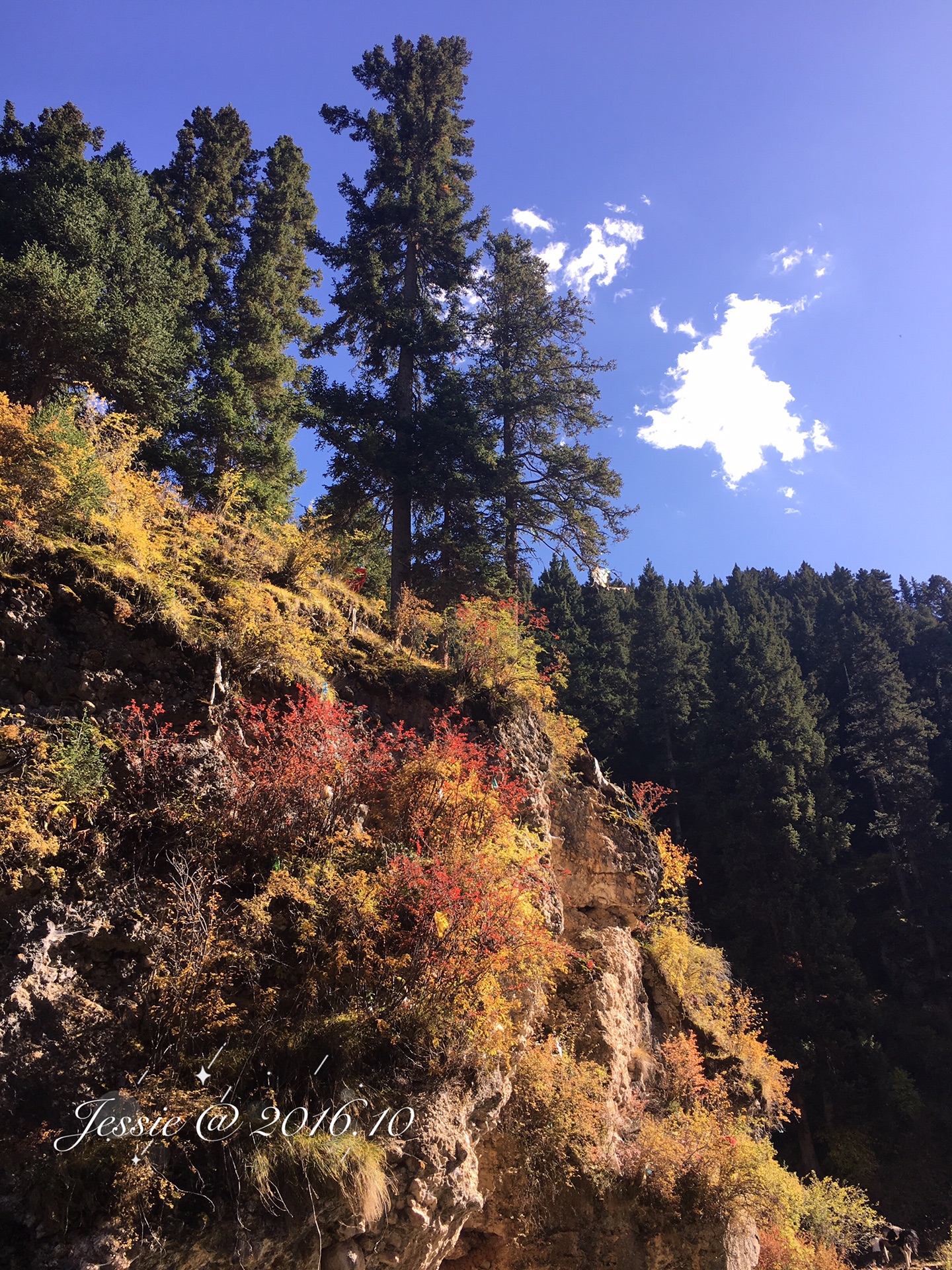 格尔底寺往里走就是白马河的源头。在从夏河到郎木寺这一路都是草原,很少有树木灌木,到了四川境内竟然一下子都了树木,红绿黄三色铺满山体,顿时秋意满满。