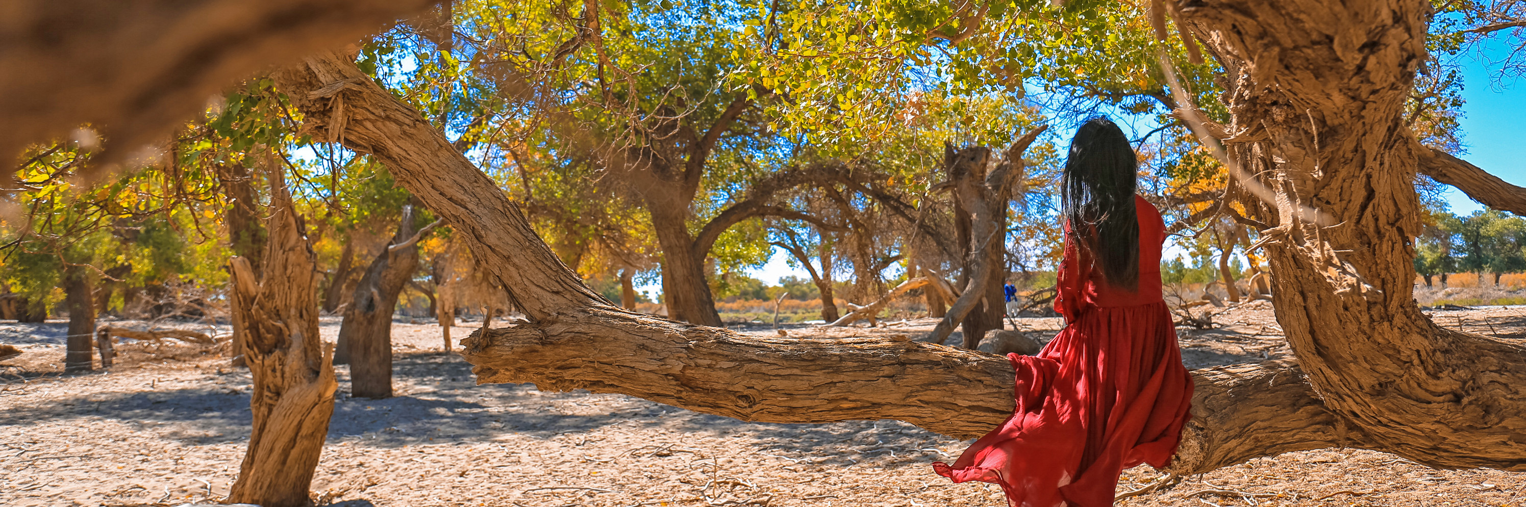 额济纳旗里金色的胡杨林,衬着湛蓝的天空于风中婆娑起舞。