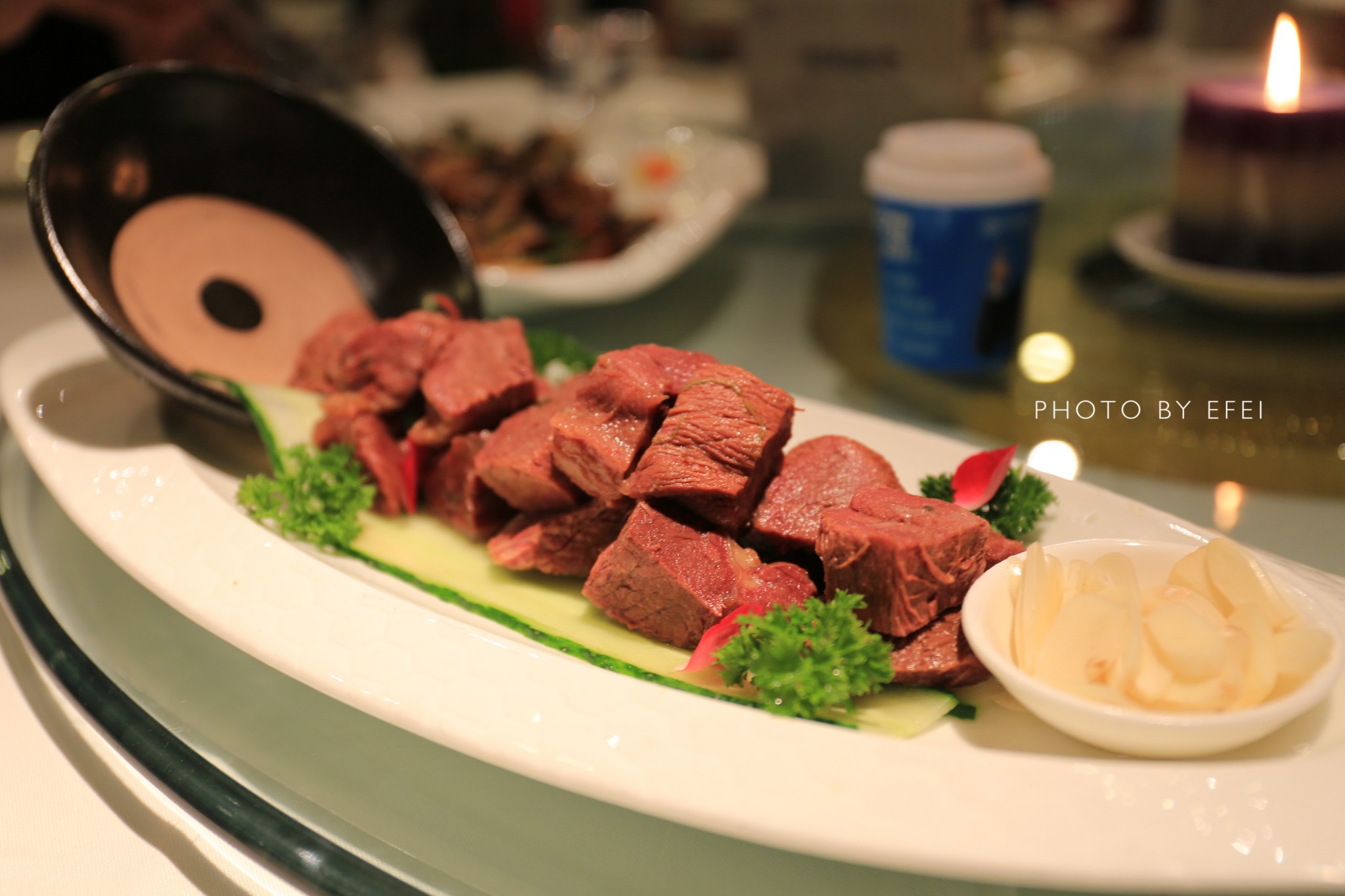 大块的牛肉,配上蒜瓣。