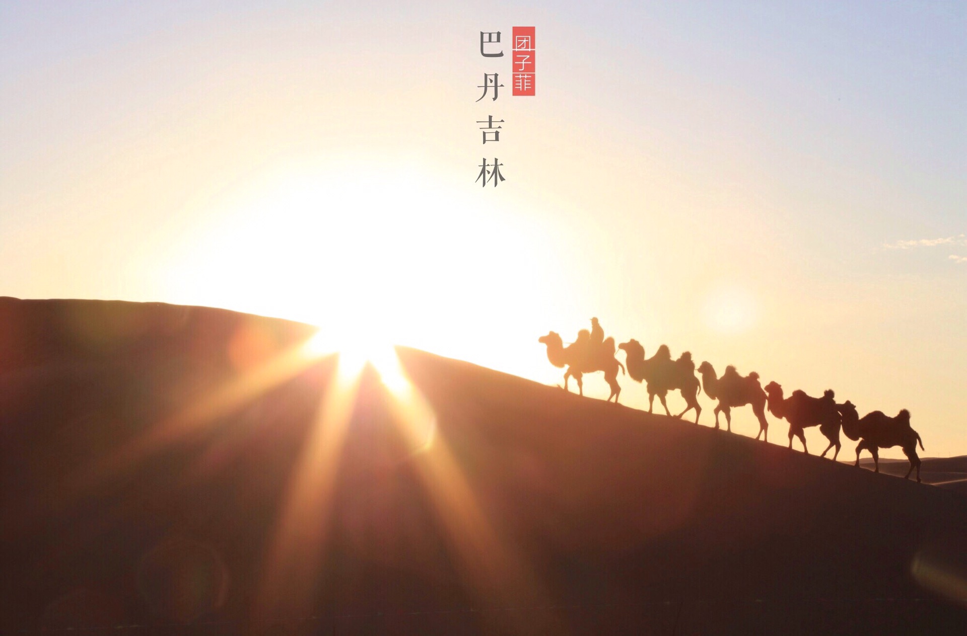 巴丹吉林的沙漠上的驼影映衬着初升的太阳,