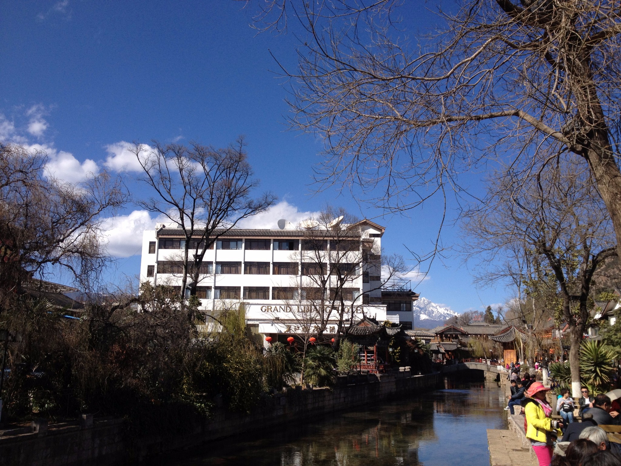 丽江古城的大门口,站在桥上北望,就是这个画面。那幢白色的五层楼就是我们这一周临时的家:格兰酒店。设施有些年头了,有些老旧的样子,虽然是四星,可是与五星的官房属实差了几条街。唯一的优点就是坐落在古城门口,方便我们在古城的任何一个角落发呆。