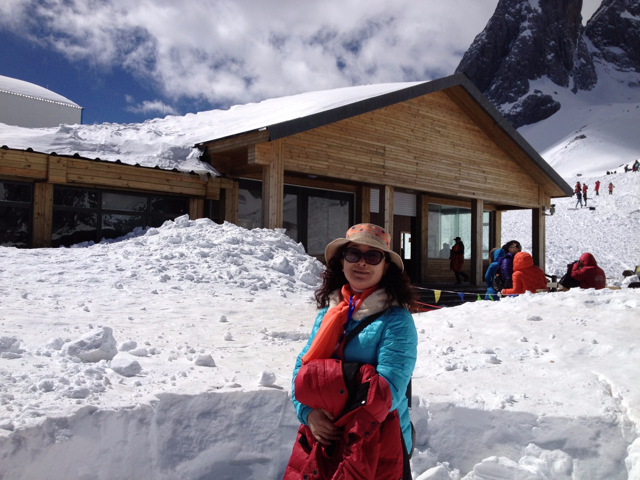这个画风有点怪?羽绒服加凉帽?雪山的温度比山下低好多,我自己的这件都无法彻底保暖,还需要租一件大衣。可是晴朗的天空中太阳就那么无遮无挡的放肆的照着,高山之上,离太阳更近了,帽子是用来防晒的。