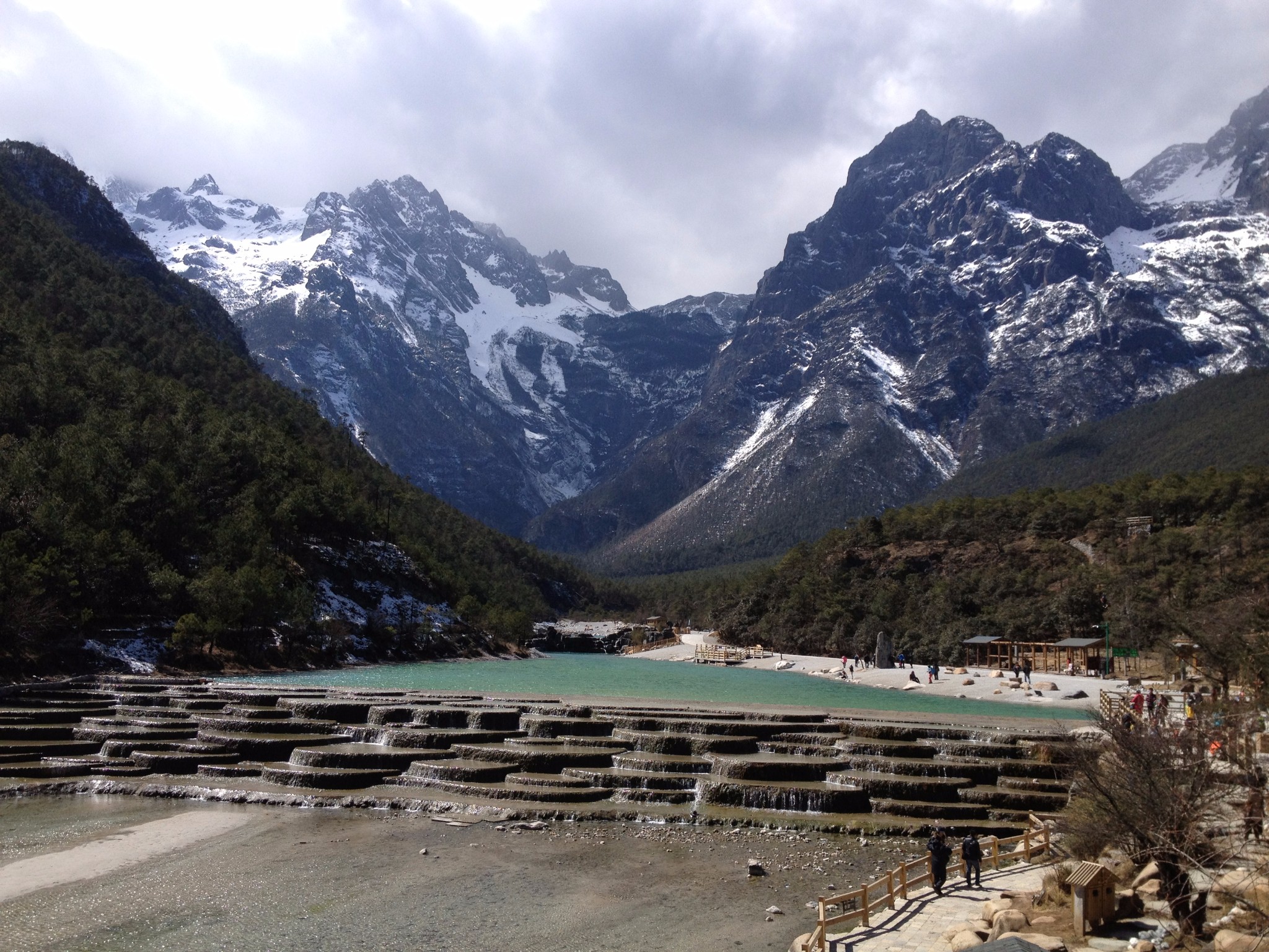 白水台,像极了层层叠叠的小小的瀑布,雪山融水,由上而下缓缓而来,形成一个景观。两岸的苍松,背后的雪山,构成一幅宁静的画面。美呆了!