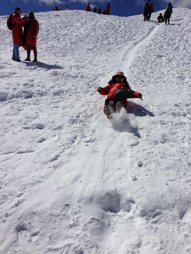 开心而勇敢的年轻人,开辟了一条滑道,喧闹的笑声吸引了我,一溜歪斜的赶过去,这么老了,还是静静的围观吧!不知是谁在旁边撺掇,我们有点心动了,不然就试试吧、之后这张照片就诞生了!那一点点小冒险,让我一下子觉得自己还不老。