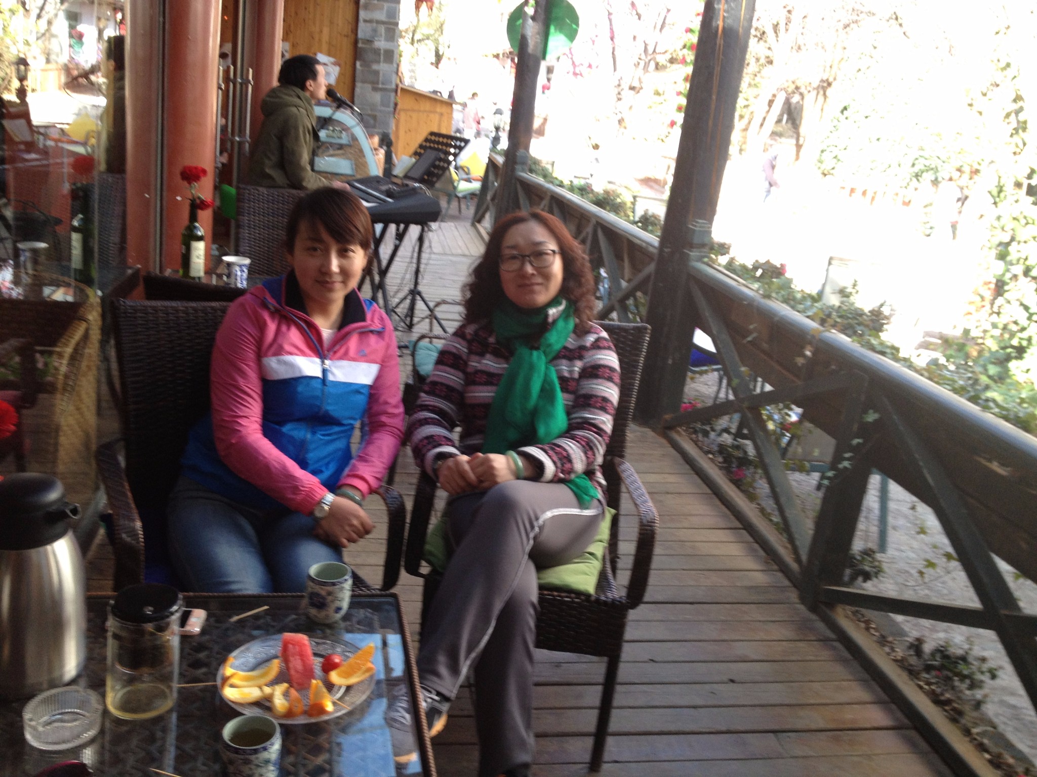 选一个带游廊的吧,视野还算开扩,点一壶兰贵人,配一个新鲜果盘,我们有一搭没一搭的聊着天,背景是驻唱歌手轻轻的吟唱。