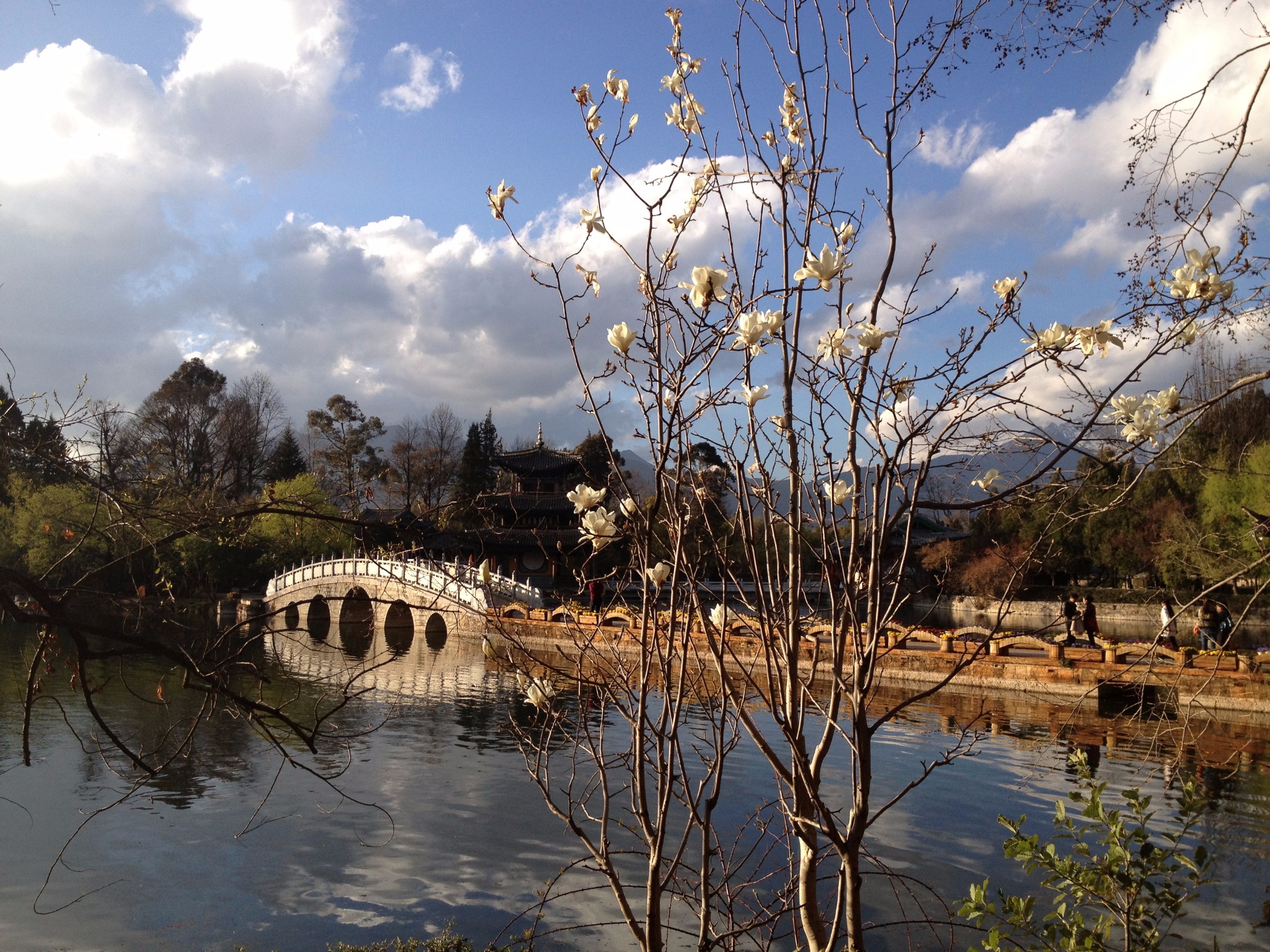 从桥上下来一条石板路贯穿南北。云南不愧是四季如春,看看这景致,完全是春天的样子了。